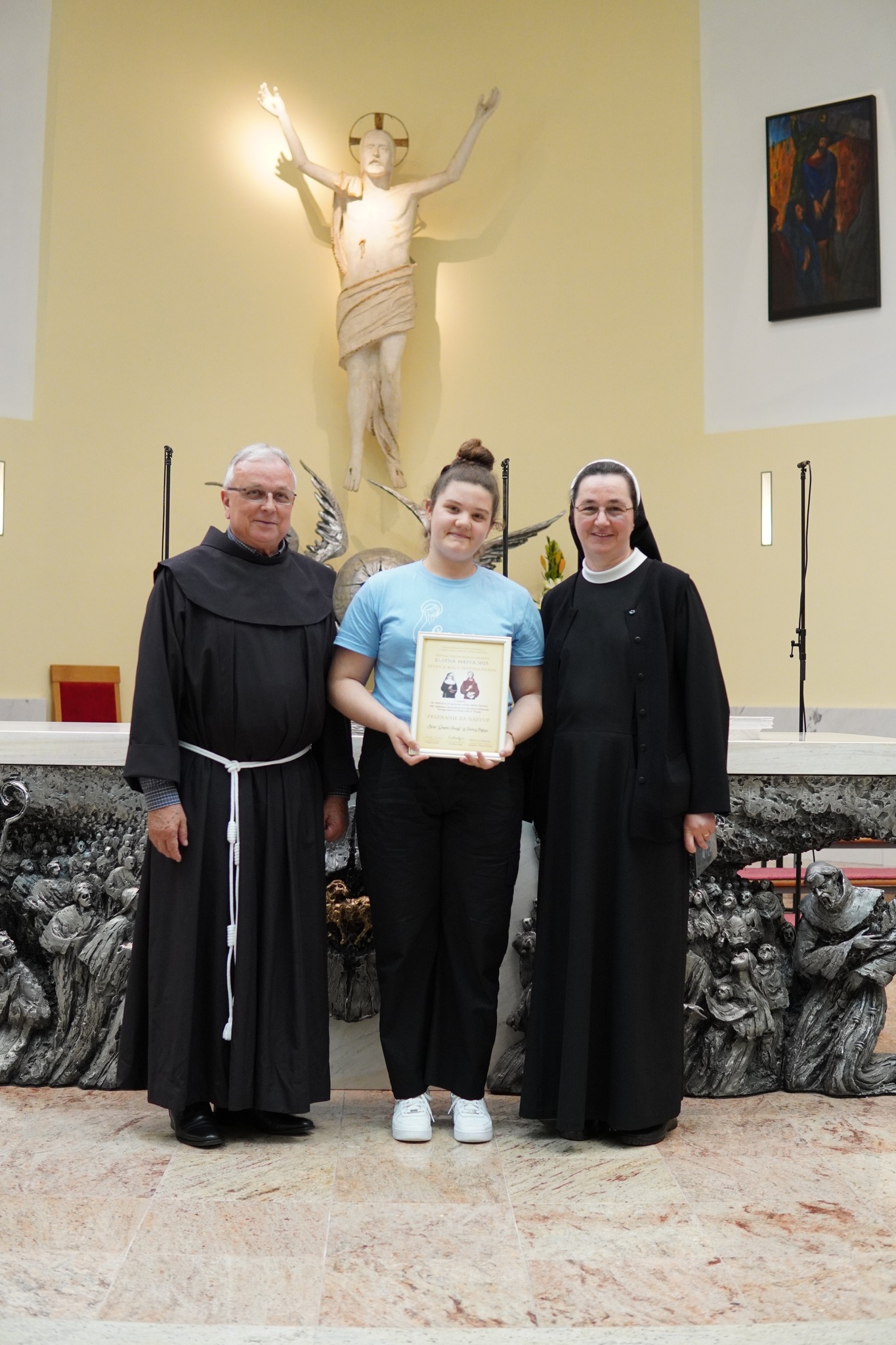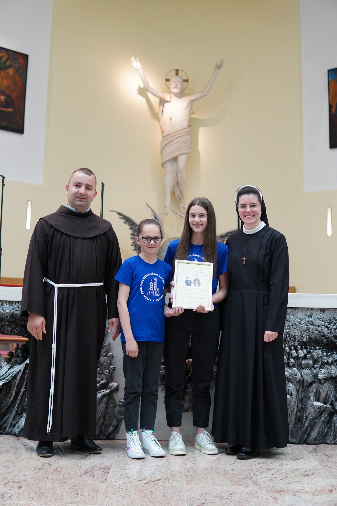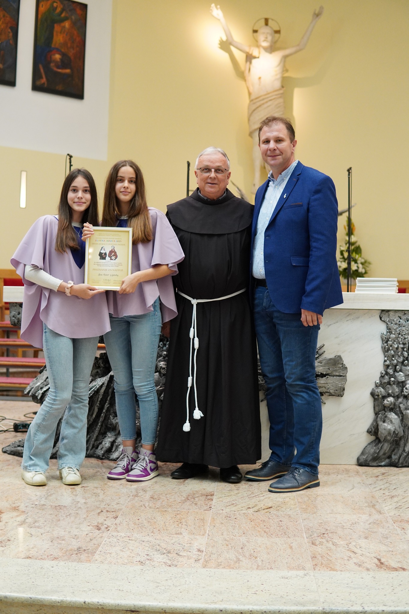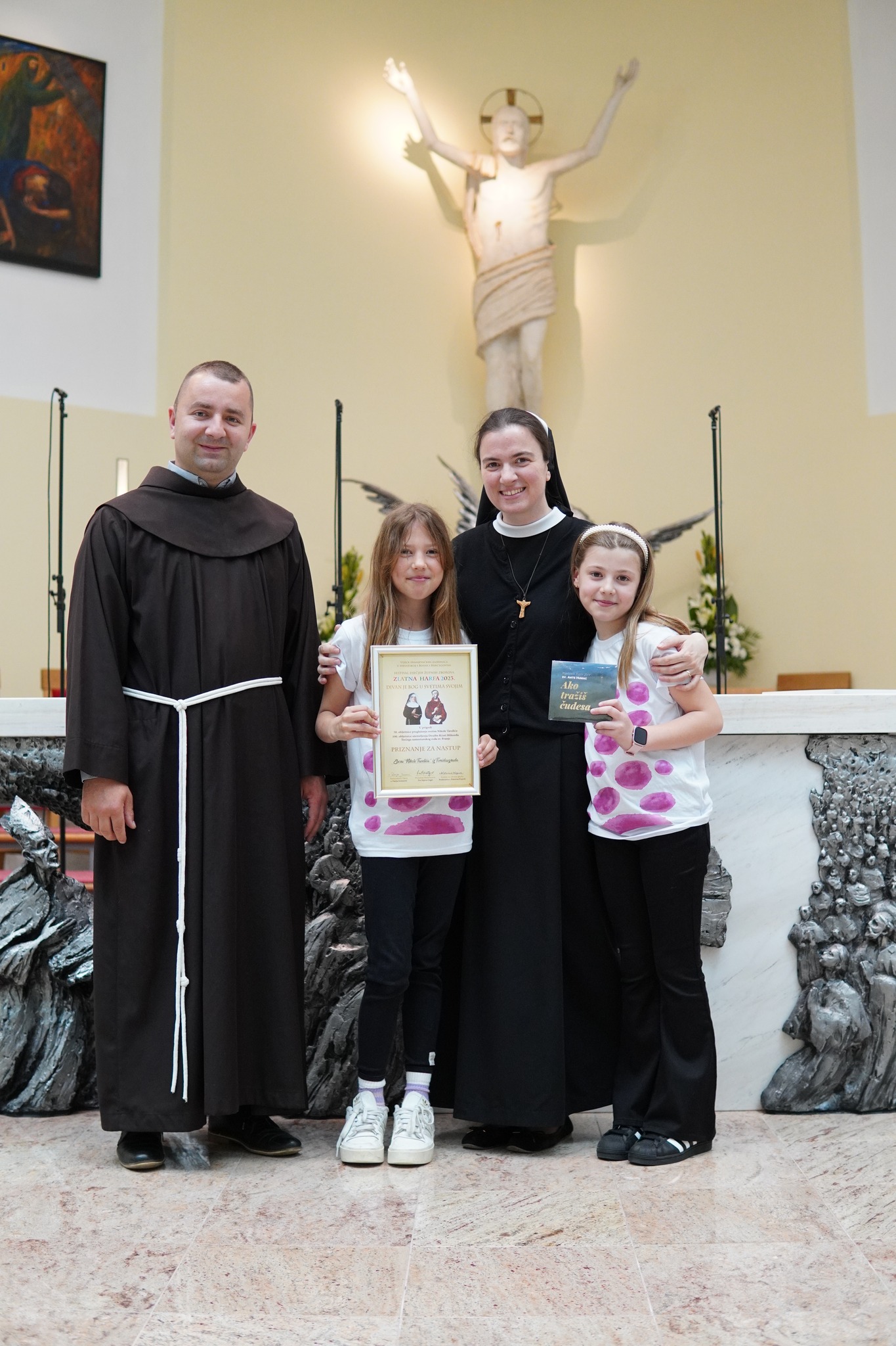 Voditelji dječjih zborova, koji su nastupili na Zlatnoj harfi na Humcu, dobili su i svečane diplome, koje su im uručili dosadašnji pročelnik Zlatne harfe fra Stipica Grgat i njegov nasljednik fra Emanuel Josić.