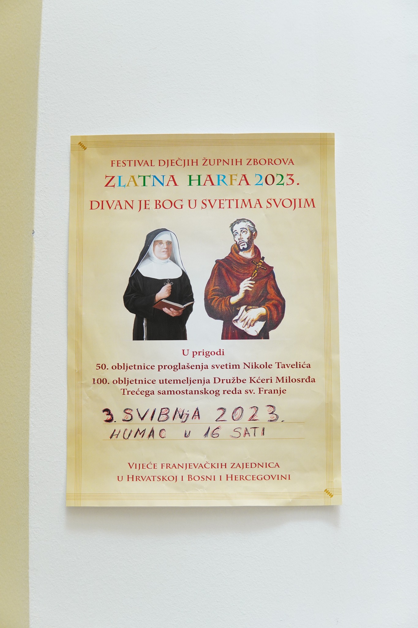 Na temu „Divan je Bog u svetima svojim“, jučer 3. svibnja, u crkvi sv. Ante na Humcu, obilježena je 39. obljetnica smotre dječjih zborova Zlatna harfa, na kojoj se okupilo oko 500 pjevača i 10 zborova s područja Hercegovine. Po dvije pjesme otpjevali su članovi dječjeg zbora Radost iz Ljubuškog, Golubići mira iz Međugorja, Gospini Slavuji iz Širokog Brijega, Raspjevani Anđeli iz Čitluka, Zbor fra Grga Martić iz Posušja, Ključići svetog Petra iz Kočerina, Zbor Nikole Tavelića iz Tomislavgrada, Zbor Svetog Stjepana Prvomučenika iz župe Gorica-Sovići, Anđeli iz Dobrkovića, te domaćini Ljiljani svetoga Ante sa Humca. Misno slavlje od 18 sati predslavio je novi pročelnik Zlatne harfe fra Emanuel Josić, koji je za naš radio kazao kako mu je ovaj susret ispunio dušu, te objasnio koliko je Zlatna harfa važna za djecu, za male pjevače.