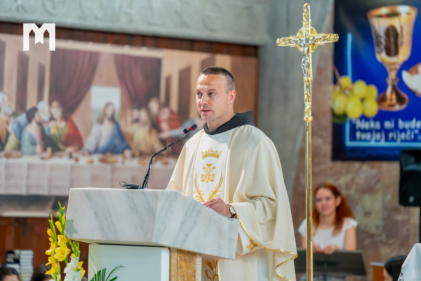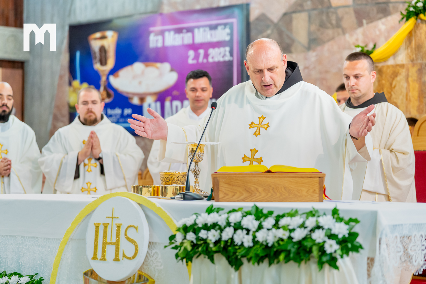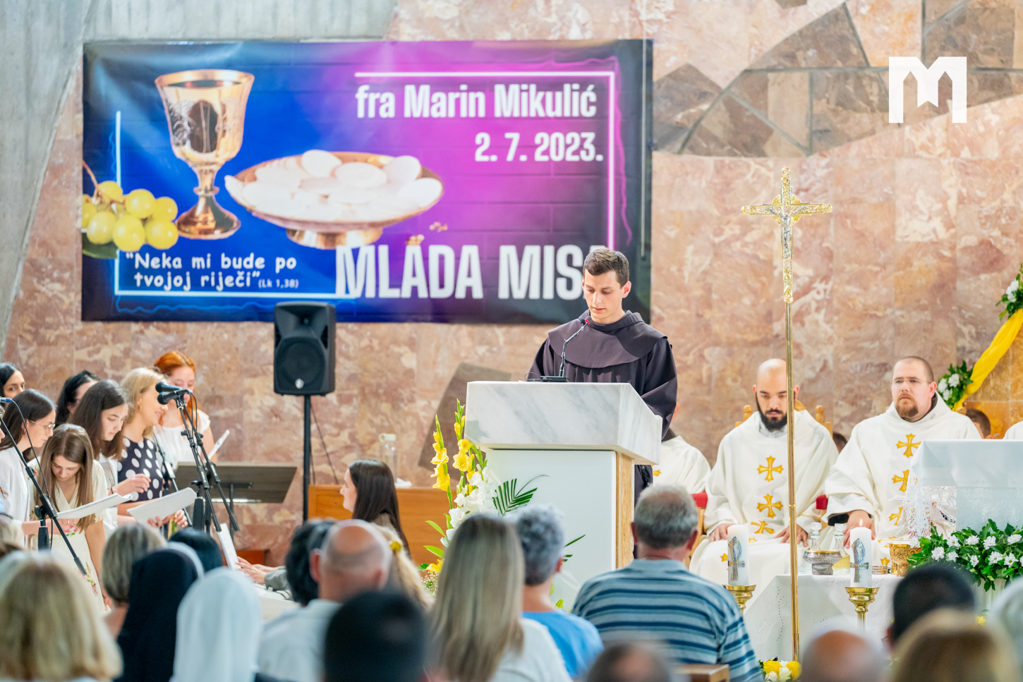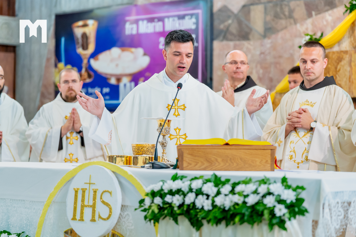 „Dragi fra Marine, imao si danas posebnu duhovnu privilegiju da ovdje možeš među nama, Bogu hvala zdrav i duhovno i tijelom, slaviti Gospodina i svoju mladu misu. Prišli su ti tvoji roditelji, otac i majka, stavili su ruke na tebe. One ruke koje su te prve dočekale kada si došao na ovaj svijet, one ruke koje su te kao dječačića i bebu presvlačile, one ruke koje su te odgajale, one ruke kad su ti ćaća i mater sklapali ruke i učili moliti. Što možemo reći, nego slavim te Bože i zahvaljujemo ti. Dragi mladomisniče, pitano je jesi li dostojan, a baš danas vidimo u Evanđelju koje je predivno otpjevao njegov rođak, naš starosjedilac fra Stanko Banožić kako se pjeva je li dostojan, a to znači ne samo čestitošću života i moralno duhovnim odlikama ćudoređa, nego ljubiš li više Isusa nego li oca i majku, onu majku koja te je odgojila i ruke na te položila, onoga ćaću koji je ovdje u prvom redu crkve svoje. Ljubiš li više Krista nego one koji su po krvi tvoji? Ako jesi, kaže Isus, dostojan si mene”, kazao je fra Mario Knezović, te se zahvalio na Božjem pozivu, ali i na fra Marinovom odazivu.