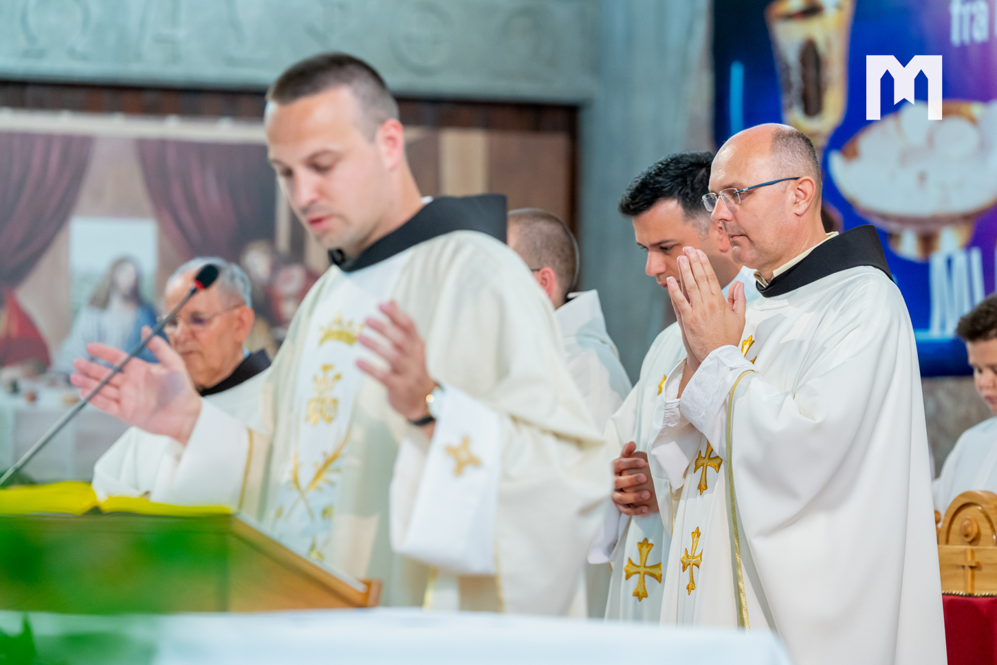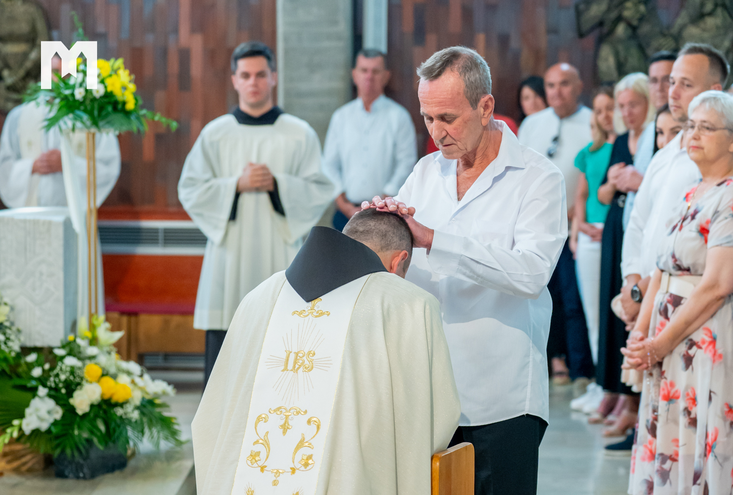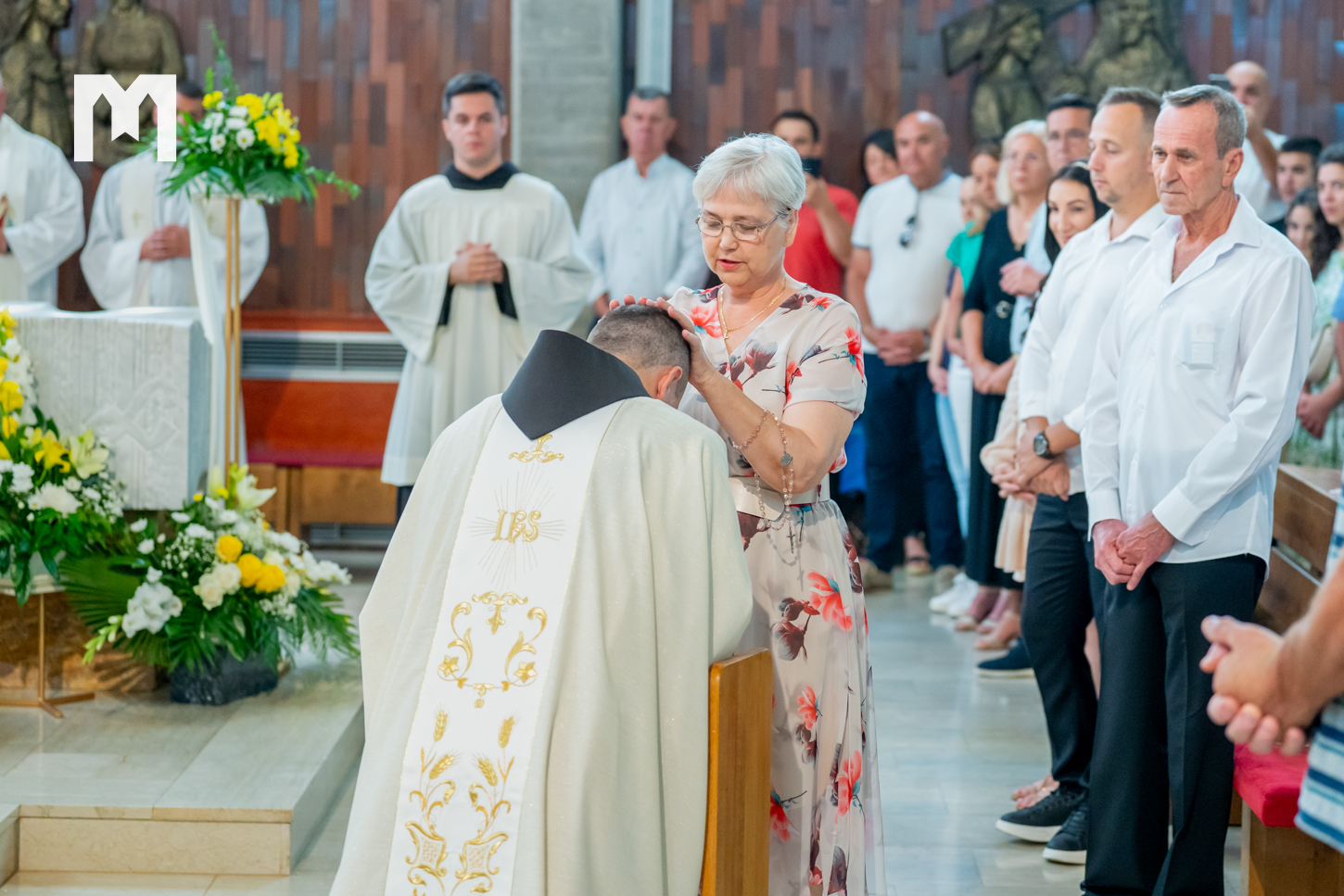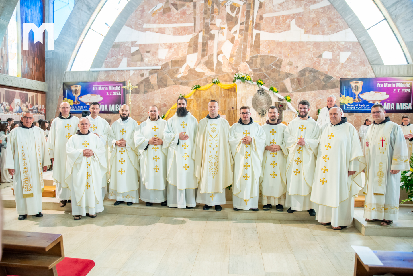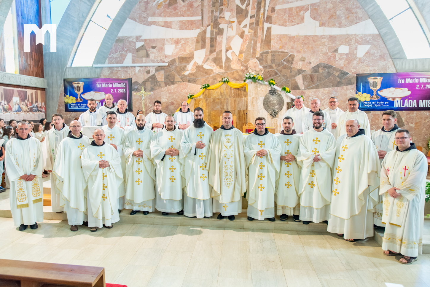 „Dragi fra Marine, imao si danas posebnu duhovnu privilegiju da ovdje možeš među nama, Bogu hvala zdrav i duhovno i tijelom, slaviti Gospodina i svoju mladu misu. Prišli su ti tvoji roditelji, otac i majka, stavili su ruke na tebe. One ruke koje su te prve dočekale kada si došao na ovaj svijet, one ruke koje su te kao dječačića i bebu presvlačile, one ruke koje su te odgajale, one ruke kad su ti ćaća i mater sklapali ruke i učili moliti. Što možemo reći, nego slavim te Bože i zahvaljujemo ti. Dragi mladomisniče, pitano je jesi li dostojan, a baš danas vidimo u Evanđelju koje je predivno otpjevao njegov rođak, naš starosjedilac fra Stanko Banožić kako se pjeva je li dostojan, a to znači ne samo čestitošću života i moralno duhovnim odlikama ćudoređa, nego ljubiš li više Isusa nego li oca i majku, onu majku koja te je odgojila i ruke na te položila, onoga ćaću koji je ovdje u prvom redu crkve svoje. Ljubiš li više Krista nego one koji su po krvi tvoji? Ako jesi, kaže Isus, dostojan si mene”, kazao je fra Mario Knezović, te se zahvalio na Božjem pozivu, ali i na fra Marinovom odazivu.