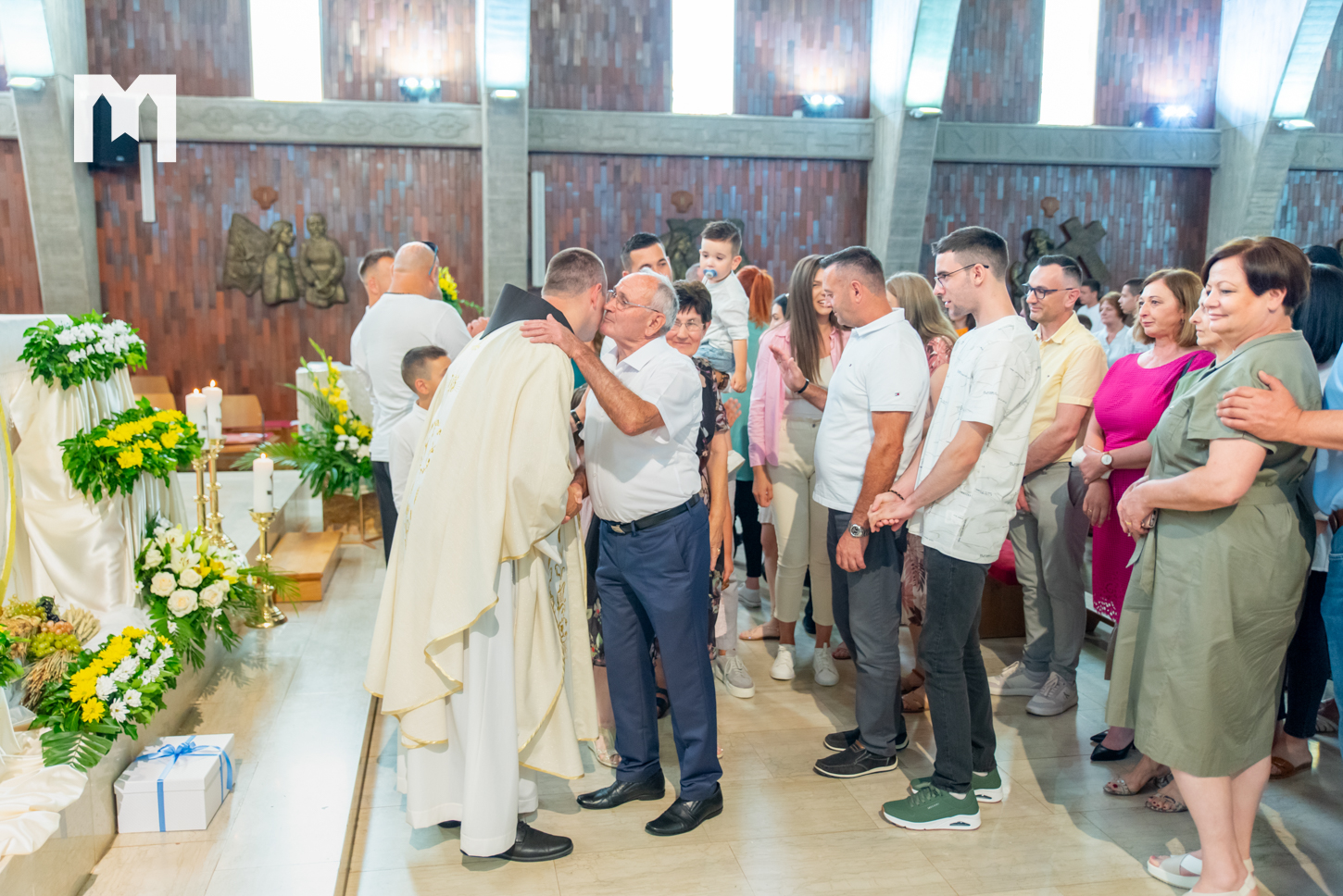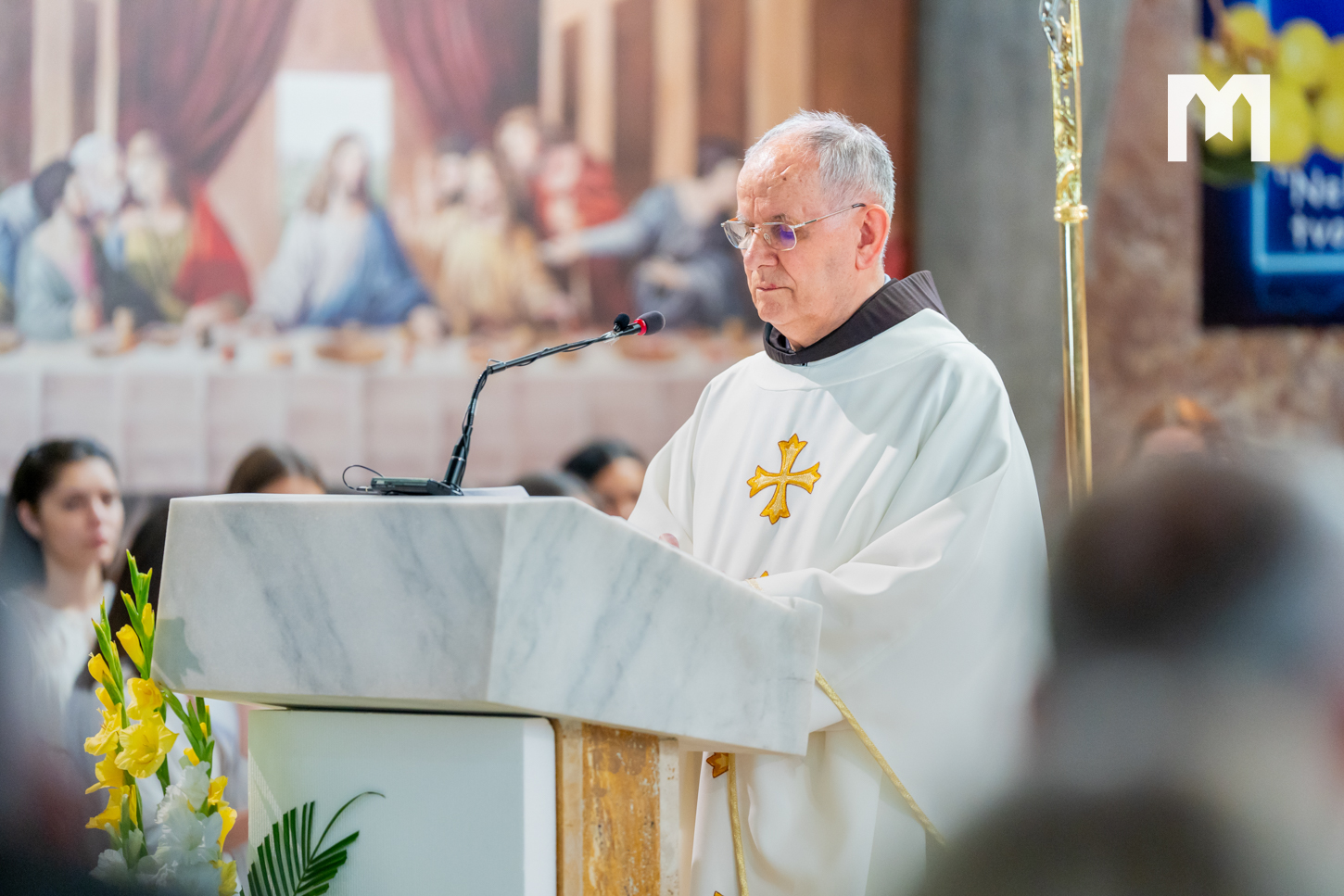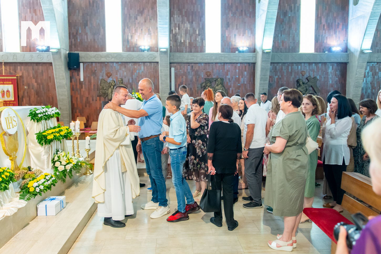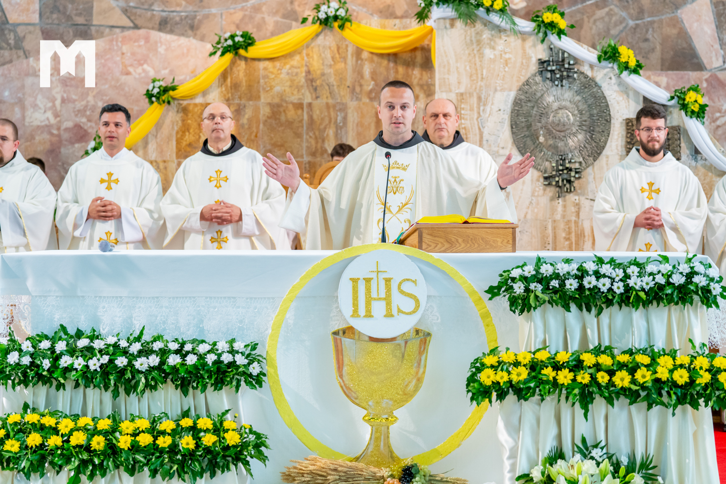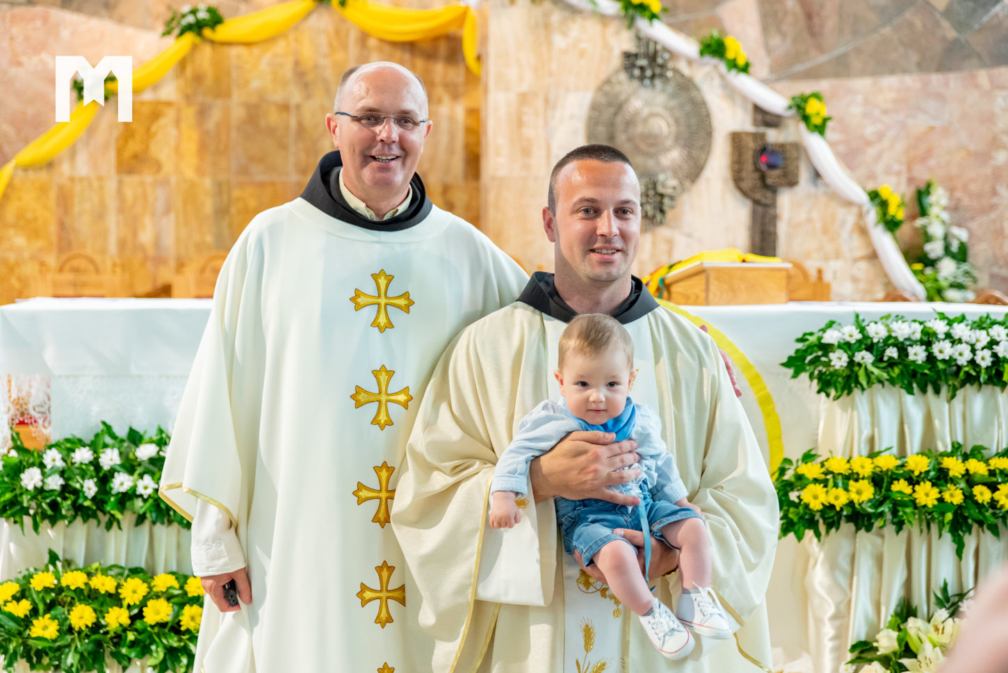 „Dragi fra Marine, imao si danas posebnu duhovnu privilegiju da ovdje možeš među nama, Bogu hvala zdrav i duhovno i tijelom, slaviti Gospodina i svoju mladu misu. Prišli su ti tvoji roditelji, otac i majka, stavili su ruke na tebe. One ruke koje su te prve dočekale kada si došao na ovaj svijet, one ruke koje su te kao dječačića i bebu presvlačile, one ruke koje su te odgajale, one ruke kad su ti ćaća i mater sklapali ruke i učili moliti. Što možemo reći, nego slavim te Bože i zahvaljujemo ti. Dragi mladomisniče, pitano je jesi li dostojan, a baš danas vidimo u Evanđelju koje je predivno otpjevao njegov rođak, naš starosjedilac fra Stanko Banožić kako se pjeva je li dostojan, a to znači ne samo čestitošću života i moralno duhovnim odlikama ćudoređa, nego ljubiš li više Isusa nego li oca i majku, onu majku koja te je odgojila i ruke na te položila, onoga ćaću koji je ovdje u prvom redu crkve svoje. Ljubiš li više Krista nego one koji su po krvi tvoji? Ako jesi, kaže Isus, dostojan si mene”, kazao je fra Mario Knezović, te se zahvalio na Božjem pozivu, ali i na fra Marinovom odazivu.