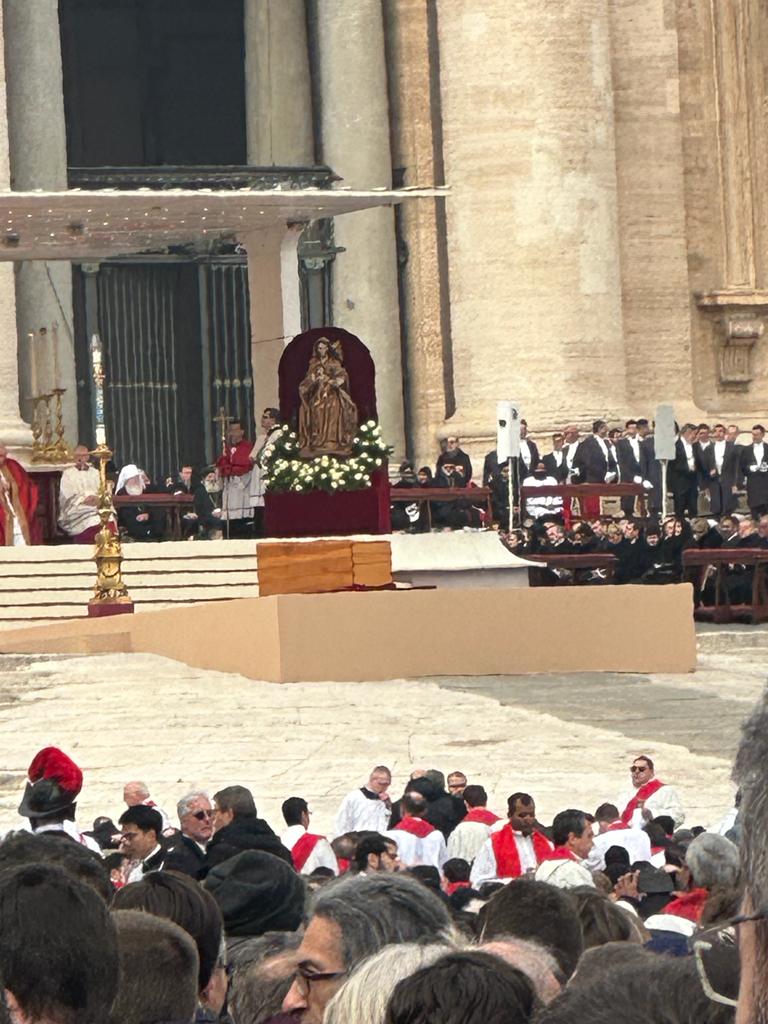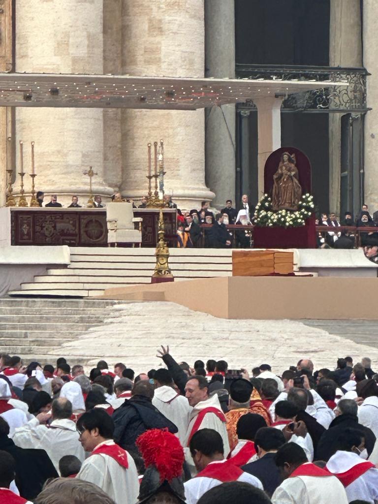 Lijes je iznesen uz tihu pratnju orgulja te položen na tlo ispred oltara na Trgu sv. Petra. Na njega su potom ravnatelj papinskih liturgijskih slavlja mons. Diego Ravelli i mons. Gänswein stavili Evanđelje, a pored je gorjela uskrsna svijeća. Odlazeći, Benediktov tajnik je, poklonivši se, poljubio lijes.