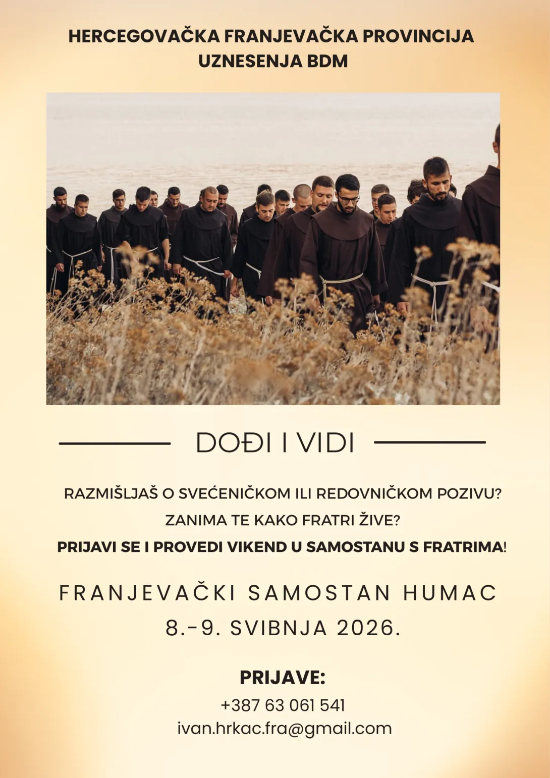 Provincijsko vijeće za promociju duhovnih zvanja Hercegovačke franjevačke provincije i ove godine organizira seminar „Dođi i vidi“ za osobe koje ozbiljno promišljaju o franjevačkom redovničkom i svećeničkom pozivu. Seminar će se održati u samostanu sv. Ante na Humcu (Ljubuški) 8. i 9. svibnja 2026. u prostorijama novicijata.