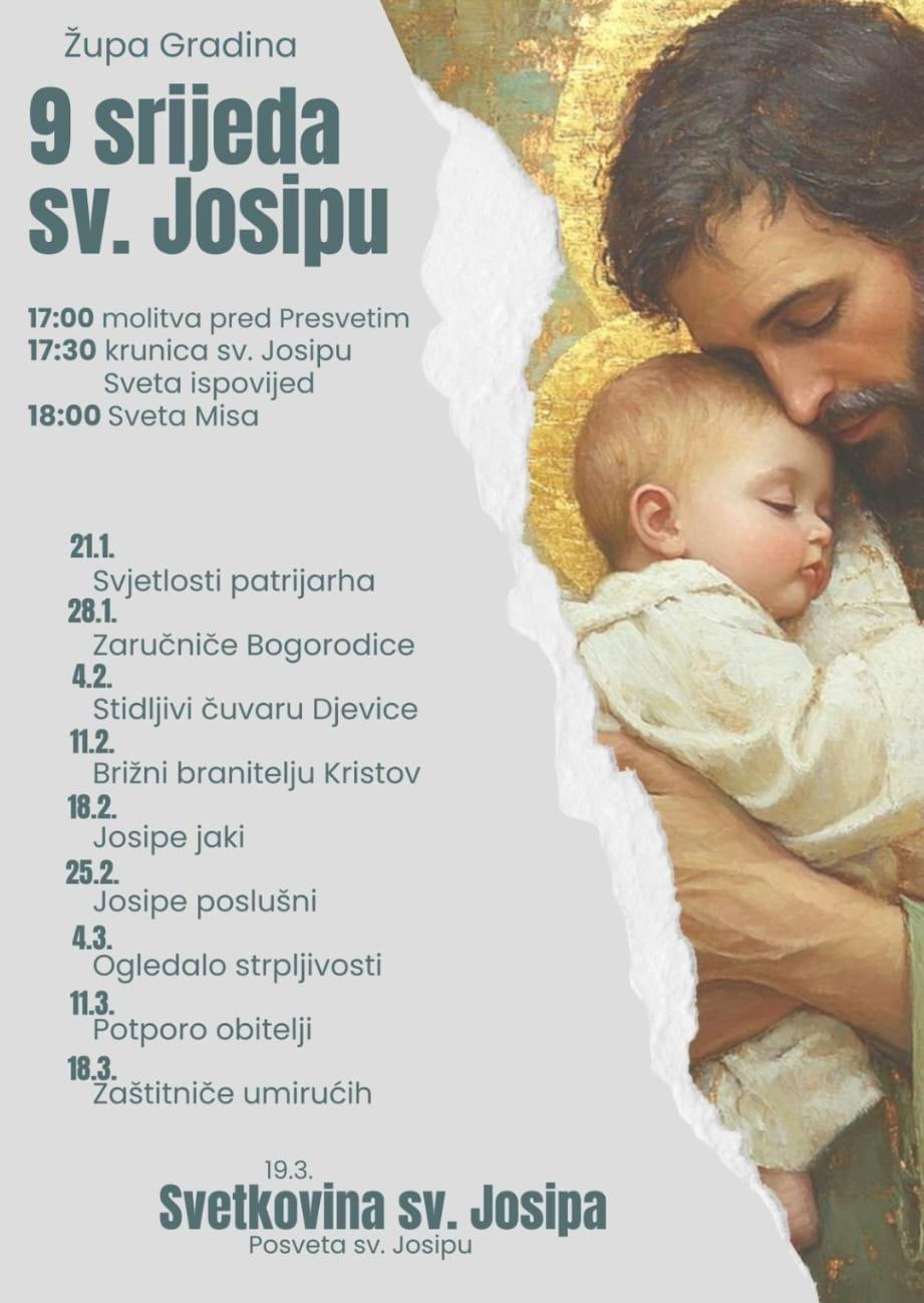 U srijedu, 21. siječnja započinje Velika devetnica sv. Josipu, koja se moli devet uzastopnih srijeda do svetkovine sv. Josipa, 19. ožujka. Velikoj devetnici sv. Josipu se pridružuje drugu godinu zaredom župa Gradina kod Čitluka, o čemu je u našem programu govorio župni vikar don Luka Cvitanović.