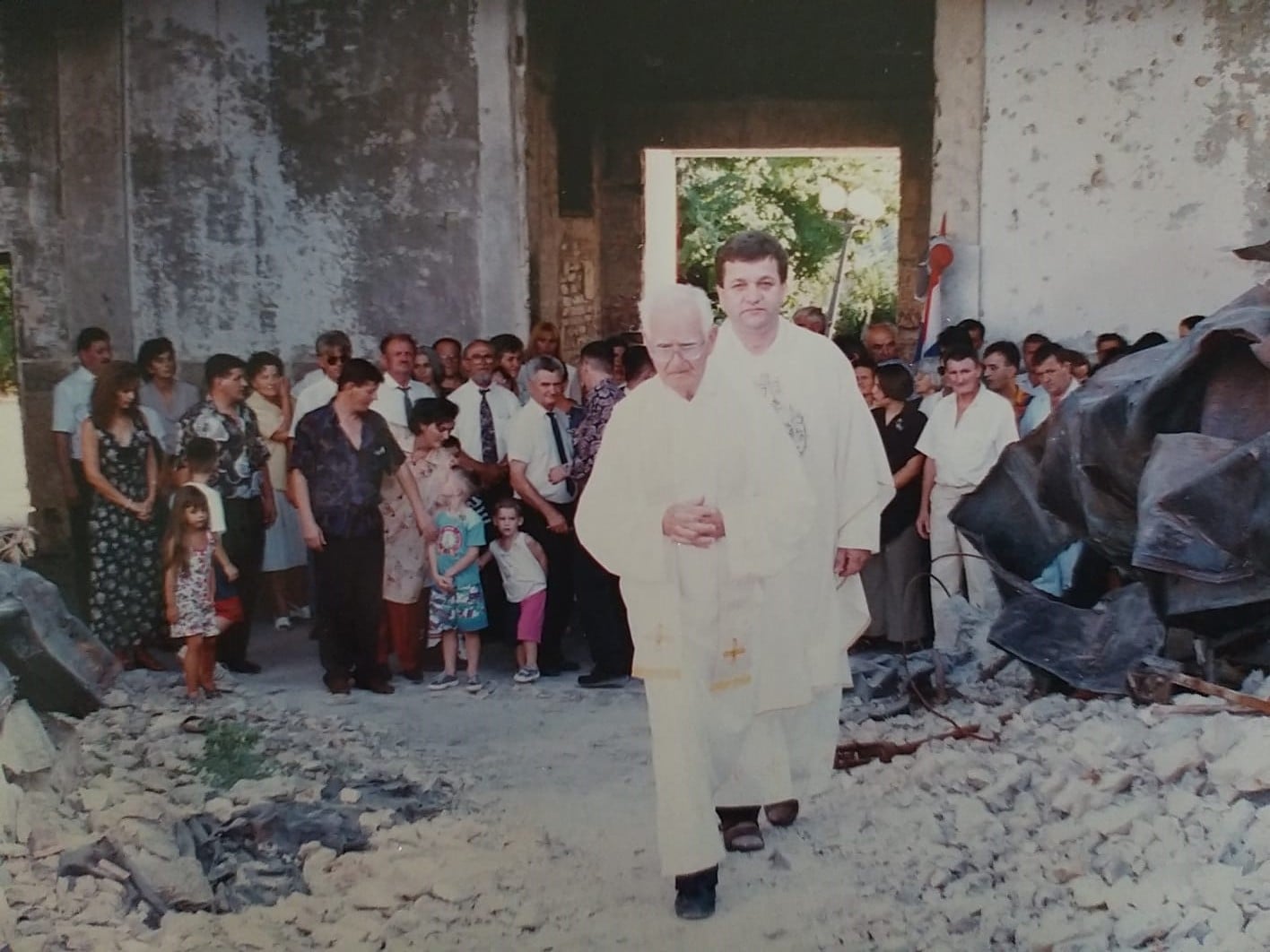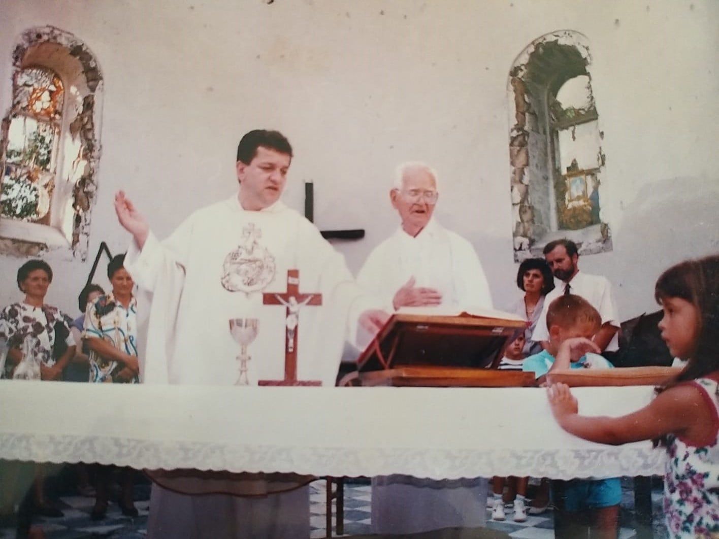 ”Ne, ne u klaustru, u crkvi, na oltaru”. I onda on ustane sav sretan, zagrli mene i njega, oči mu pune suza i kaže: ”Pa naravno da može još nitko nije pitao” (a tko bi i pitao osim nekih) I eto, Zdenka Vladić s dvjema članicama zbora se popela na razrušeni kor i pjevala nam. Vruće, 43 stupnja ali puše, limovi klapaju, crkva nema krova, pa nam je ekipa poslije govorila da je sreća jer je crkva “kabriolet” na onoj vrućini. Misu su predvodili fra Ivan Ševo i stric Robertove mame Anije fra Vilim Primorac koji je dugi niz godina služio u Kanadi. Kum Dražan Rosić, kuma Karmela Vrljić.