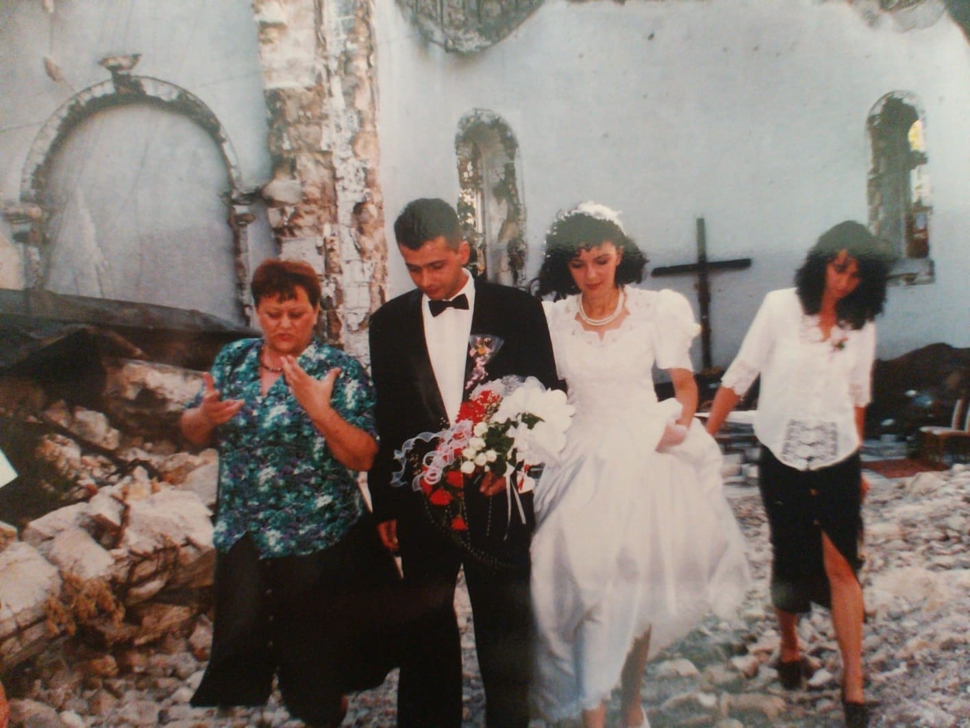 ”Kad smo u srpnju 1994. došli u razrušenu i zapaljenu crkvu svetih Petra i Pavla obaviti obred zaruka pred vjenčanje, dočekao nas je fra Ivan Ševo koji nas je oboje već dobro poznavao. Odlučili smo ga pitati hoće li nas i vjenčati 13. kolovoza ako bude slobodan taj dan, jer stizalo ga je svugdje. Danima smo već raspravljali gdje bi trebalo biti vjenčanje jer je u gradu sve načeto i porušeno i većina se tih godina vjenčavala u Međugorju ili Širokom Brijegu, najprije zbog sigurnosti onih koji dolaze na svadbu. Rat je kao stao ali još uvijek je bilo “incidenata” u kojima su ljudi gubili živote. Nije bilo sigurno, a još manje je bilo pristupačno. Robert je uporno htio da se vjenčamo u našoj crkvi, tu smo se krstili, pričestili, bilo bi glupo vjenčati se negdje drugo. Ja sam razmišljala o tome kako će reagirati ljudi, hoće li htjeti uopće doći na vjenčanje. I šta sad mi izmišljamo, crkva porušena, limovi klapaju, sve je puno kamenja, kako ću uopće ući unutra u vjenčanici, trebaju mi ravne cipele, ženska posla… Ali jače je bilo na kraju ono to je naša crkva, prošli smo rat u ovom gradu, sad da tražimo gdje ćemo se vjenčati nema smisla. I tako kažem ja Robertu: ”Ti ćeš pitati fra Ivana možemo li se vjenčati u crkvi, meni je neugodno, ne znam kako će on to shvatiti, evo umjetnika nešto izmišljaju…”
