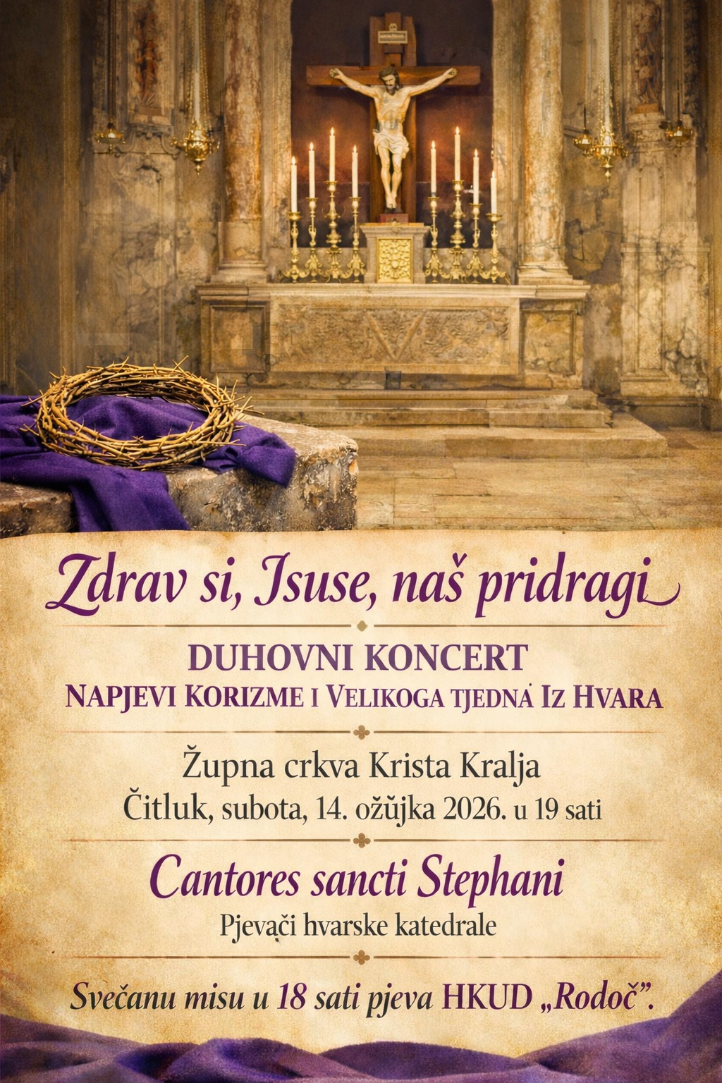 U subotu, 14. ožujka 2026. godine, u župnoj crkvi Krista Kralja u Čitluku u 19 sati održat će se duhovni koncert „Zdrav si, Isuse, naš pridragi“. Program donosi korizmene i velikotjedne napjeve iz bogate pasionske baštine grada Hvara, koje će izvesti pjevači hvarske katedrale Cantores sancti Stephani.