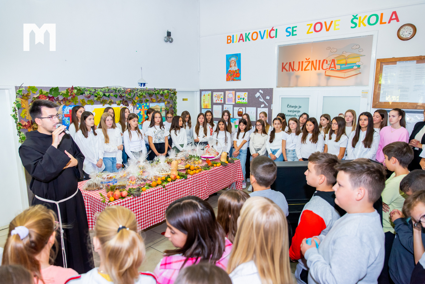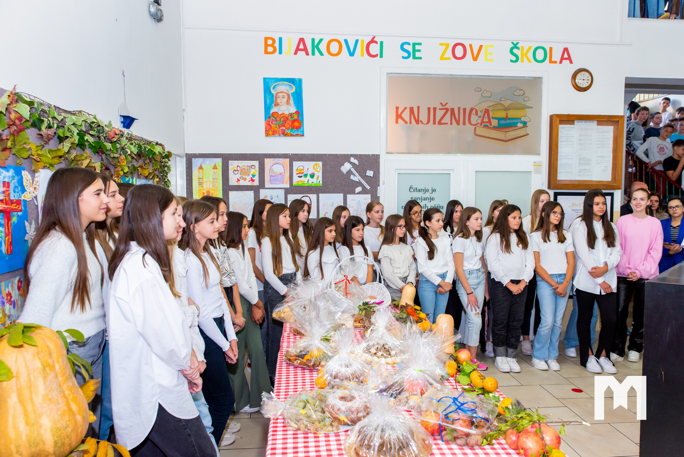 U mjesecu listopadu obilježavaju se Dani kruha, odnosno Dani zahvalnosti za plodove zemlje pa su danas učenici i djelatnici Osnovne škole Bijakovići proslavili Dane kruha u svojim školskim prostorijama. Cijela škola mirisala je na kruh, kolače, peciva, slastice… što su ih učenici ponijeli od svoje kuće, a koje su blage i vrijedne ruke njihovih majki, baki i staratelja pripravile. Bilo je tu naravno i domaćih hercegovačkih plodova kao što su šipci, ćupteri, sušene smokve, orasi i slično. Prigodni program održao se u obje školske smjene, a bilo je tu i recitacija, pjesama, radosti, ali naravno i Božjega blagoslova kojega je na hranu i na sve prisutne zazvao fra Ivan Hrkać, mladomisnik i župni vikar u Međugorju. Prije njegova obraćanja, glazbeni zbor Osnovne škole Bijakovići je zajedno sa nastavnicom glazbene kulture Ignacijom Sušac otpjevao pjesmu „Kruh i vino”, pjesmu koja govori o ljepotama Hercegovine i o plodovima zemlje koji se nalaze u njoj, a koje joj je dobri Bog darovao. Nakon pjesme, u prigodnom obraćanju školarcima i djelatnicima škole, fra Ivan je govorio o važnosti kruha našega svagdašnjega.