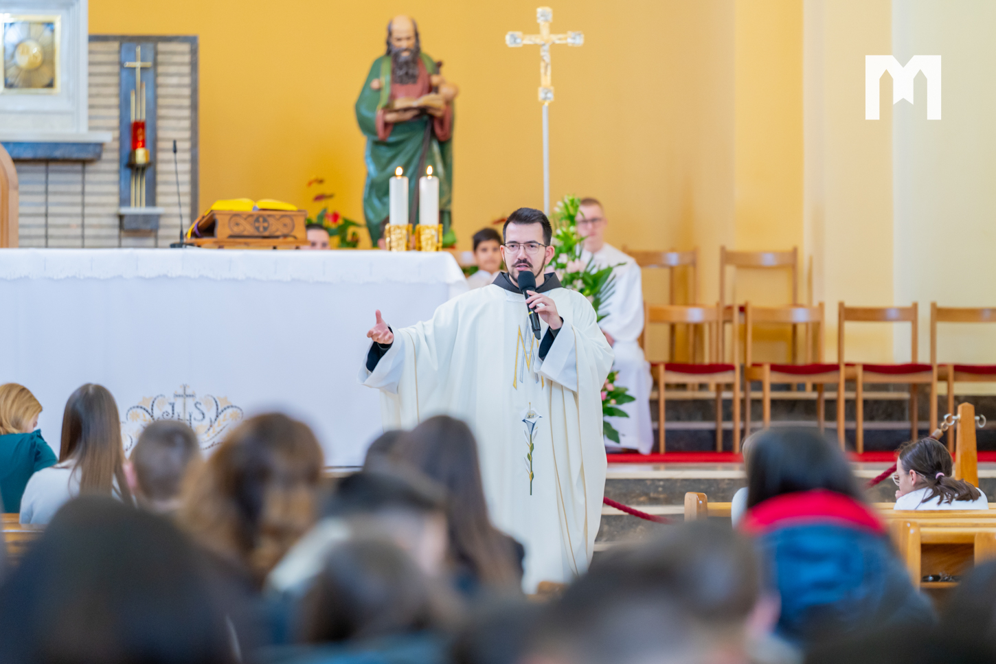 „Na ovaj dan mi Dan škole proslavljamo na drugi način, moramo znati da nije škola samo nastava, nego da je škola i reći dragome Bogu: hvala na školi koja mi je darovana, hvala na učiteljima koji su tu koji daju svoje vrijeme, svoje srce, a nekada i svoje živce. Na puno toga mi možemo zahvaliti ako hoćemo otvoriti oči, ali možemo i zažmiriti i ne vidjeti ništa. Namjerno sam danas u čitanju uzeo jednoga učenika svetoga Pavla, a on se zove Timotej. On je bio mlad, sv. Pavao ga je uzeo sebi za učenika i poučavao ga. Njemu je pisao nekoliko pisama i čuli smo jedan mali ulomak gdje mu sv. Pavao govori da rasplamsa dar vjere, dar razuma, dar mudrosti, dar svega onoga što je naučio da se to ne ugasi”, kazao je fra Ivan Hrkać te naglasio kako je škola institucija koja ima dva naziva, odgojno i obrazovno.