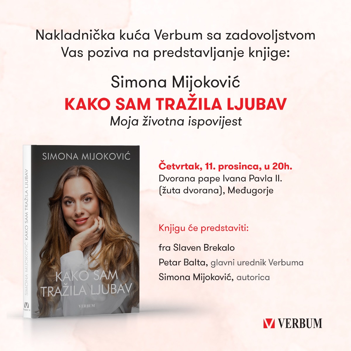 Promocija hit knjige Kako sam tražila ljubav, autorice Simone Mijoković, u Bosni i Hercegovini započinje predstavljanjem u Međugorju 11. prosinca, u Dvorani Ivana Pavla II. (žuta dvorana), s početkom u 20 sati.