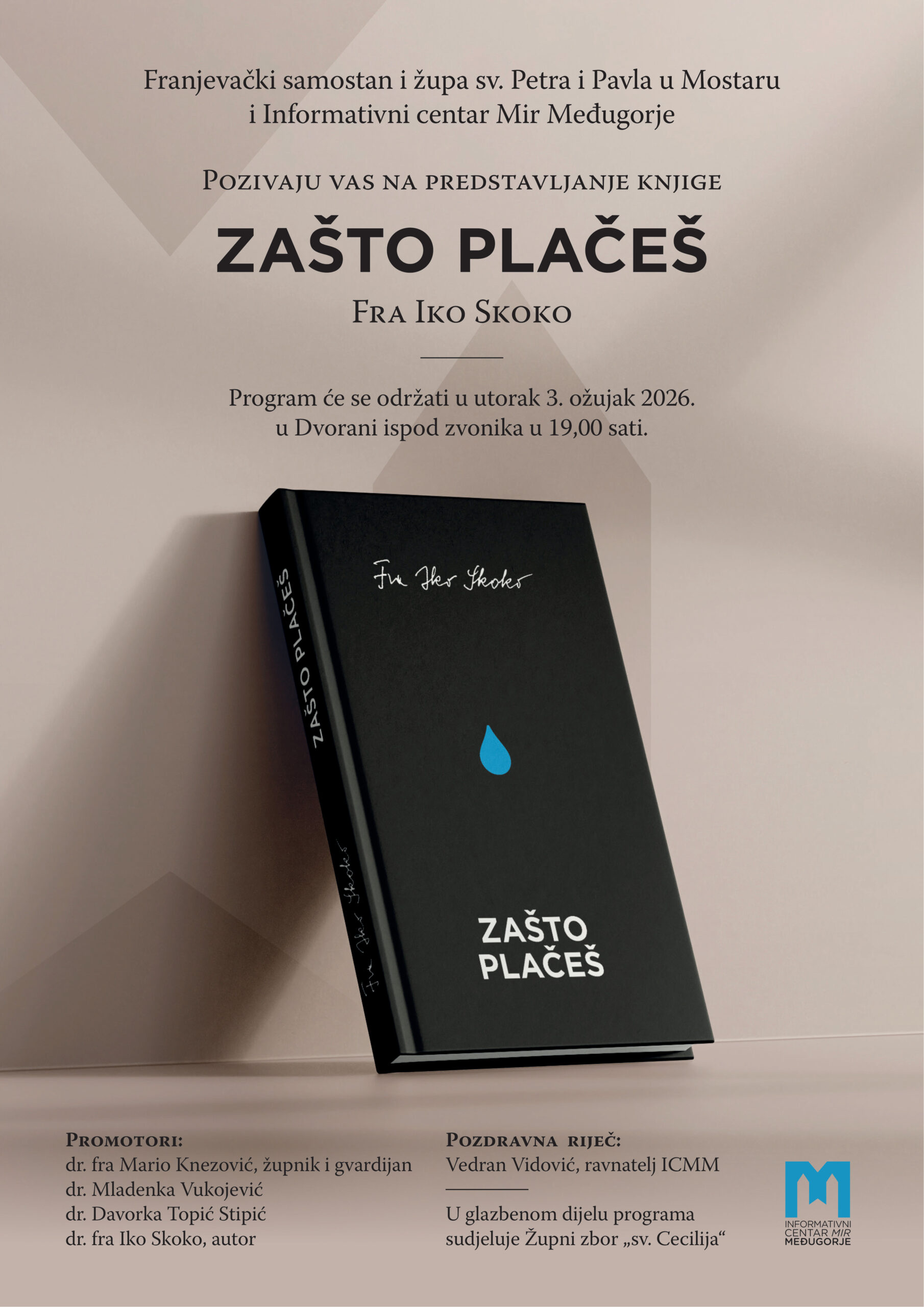 Nova knjiga fra Ike Skoke pod naslovom “Zašto plačeš” bit će predstavljena u Mostaru u utorak, 3. ožujka 2026. godine u 19 sati u Dvorani ispod zvonika franjevačke crkve sv. Petra i Pavla.