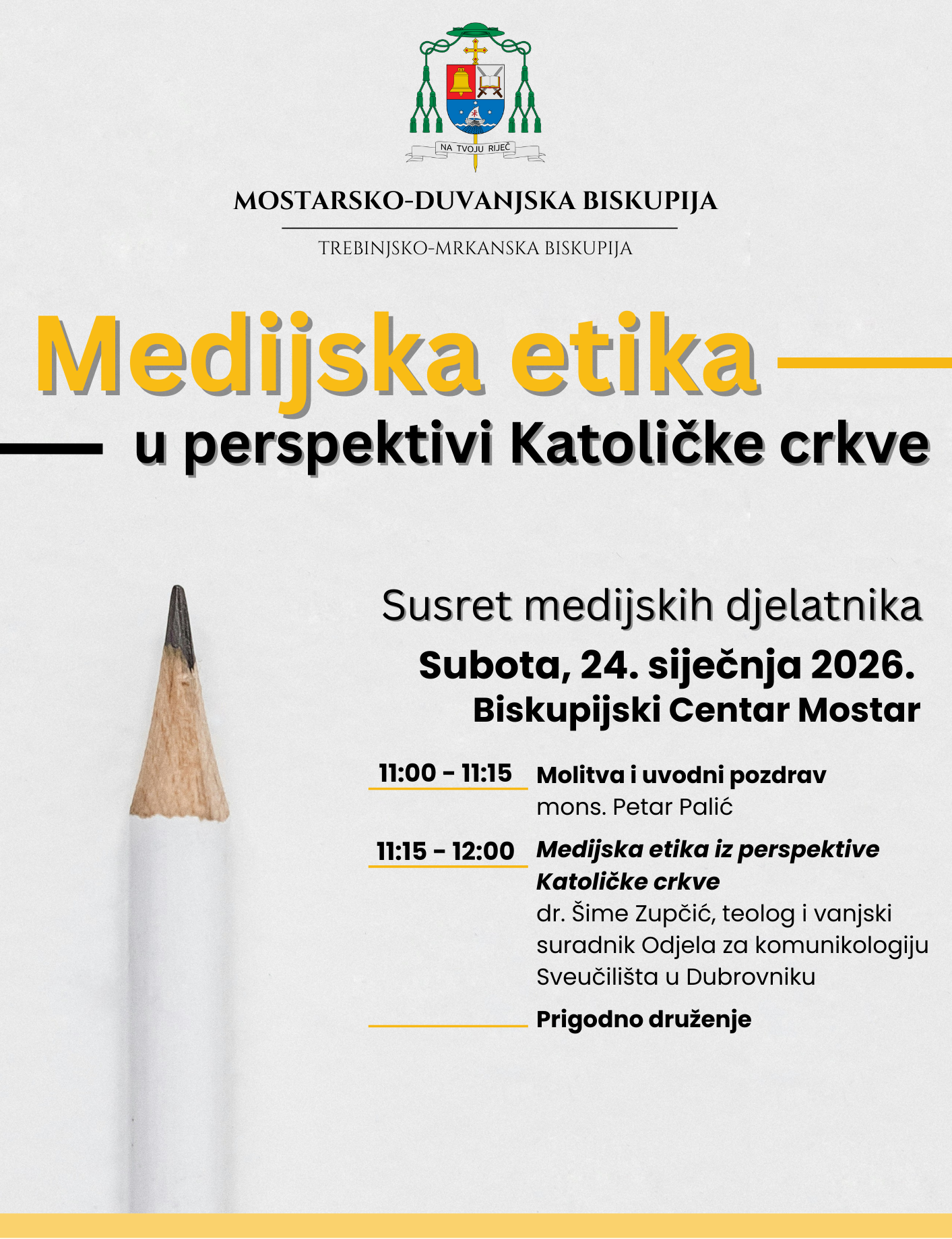 Mostarsko-duvanjska i Trebinjsko-mrkanska biskupija organiziraju susret s medijskim djelatnicima s područja ovih biskupija i pozivaju ih u subotu, 24. siječnja u Biskupijski Centar u Mostaru. Program počinje u 11 sati uvodnim pozdravom biskupa Petra Palića, nakon čega slijedi predavanje pod naslovom ,,Medijska etika iz perspektive Katoličke crkve”, koje će održati dr. Šime Zupčić, teolog i vanjski suradnik Odjela za komunikologiju Sveučilišta u Dubrovniku. Susret će završiti prigodnim druženjem.