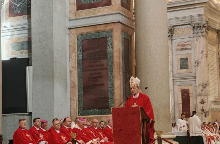 Nalazimo se na završetku svoga hrvatskog nacionalnog hodočašća u Rim u jubilarnoj 2025. godini od rođenja Isusa Krista, Spasitelja svijeta. Okupljeni smo na Euharistijsko slavlje u Bazilici svetoga Pavla apostola, Isusova svjedoka, najpoznatijega kršćanskog misionara i neumornoga hodočasnika. On je od svog obraćenja pa do kraja života sve svoje dane posvetio osobnom nasljedovanju Isusova primjera i nauka i širenju imena Božjega među narodima te je u službi toga svog poslanja prošao skoro cijeli ondašnji poznati svijet. Jasna je to i snažna poruka svima koji, ponoseći se Isusovim imenom, hodočaste u nadi da će vidjeti lice Božje te, dok hode u toj nadi, svjedoče i propovijedaju Evanđelje Kristovo i pri tomu mole zagovor apostola Pavla.