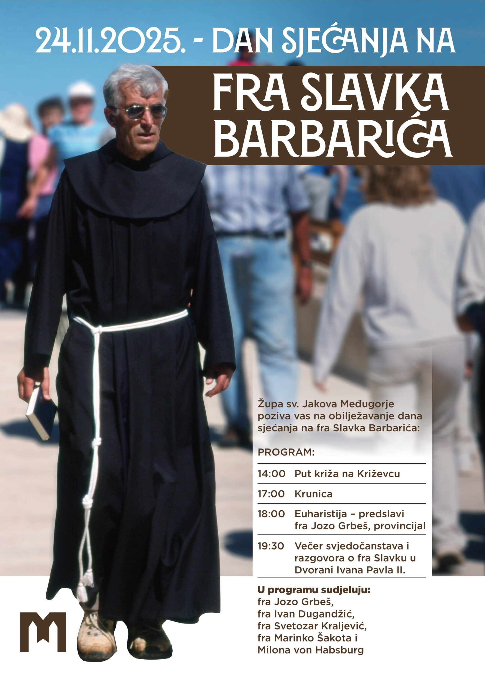 Župa sv. Jakova Međugorje organizira i poziva vas na Dan sjećanja na fra Slavka Barbarića – 24. studenog 2025. na 25. godišnjicu njegovu smrti.