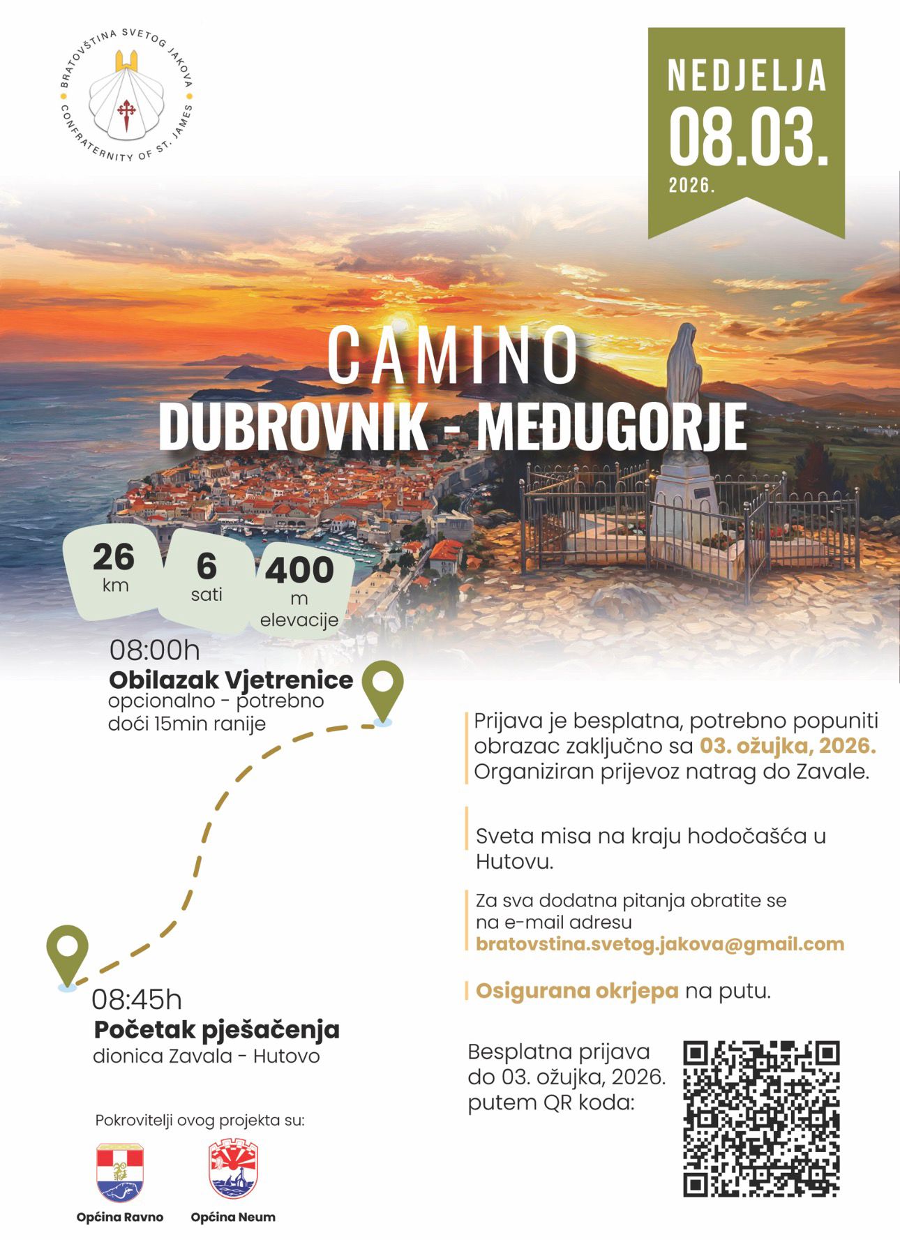 Bratovština svetog Jakova poziva na sudjelovanje u otvaranju Camina Dubrovnik – Međugorje i pridružite se pješačenju od Zavale do Hutova (cca 26 km, oko 6 sati hoda, sa 400 m elevacije).