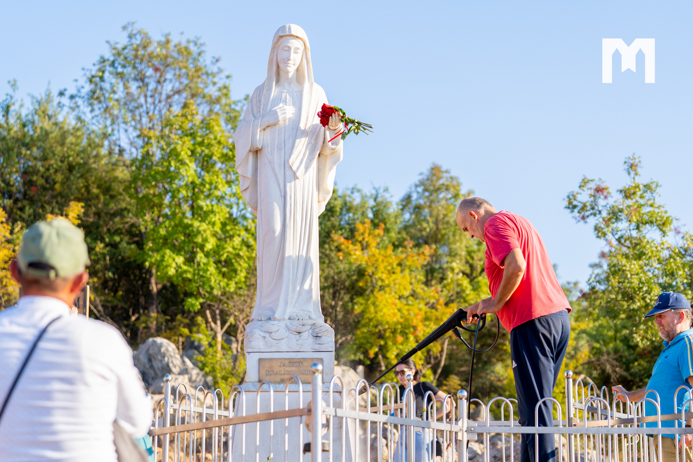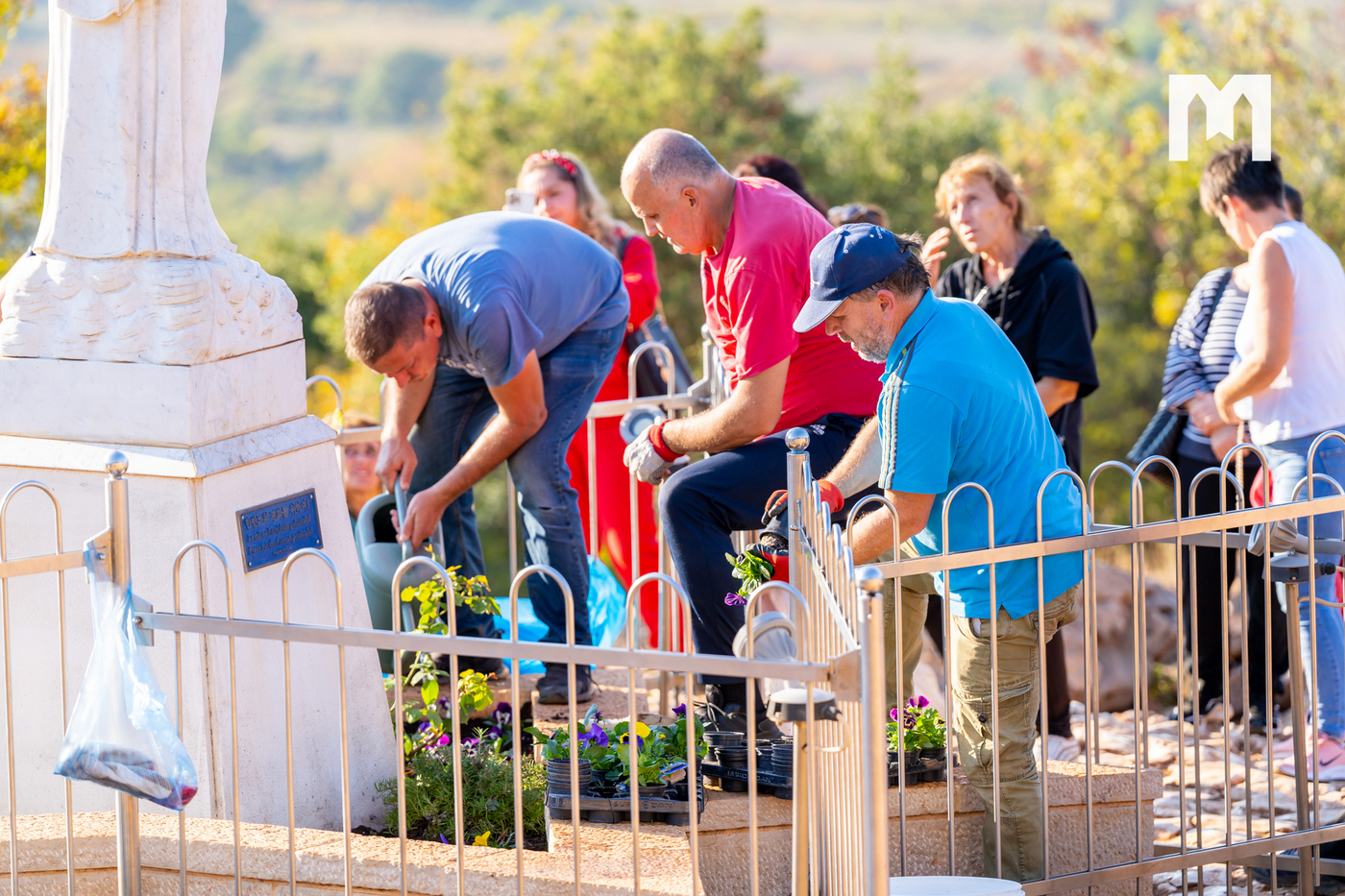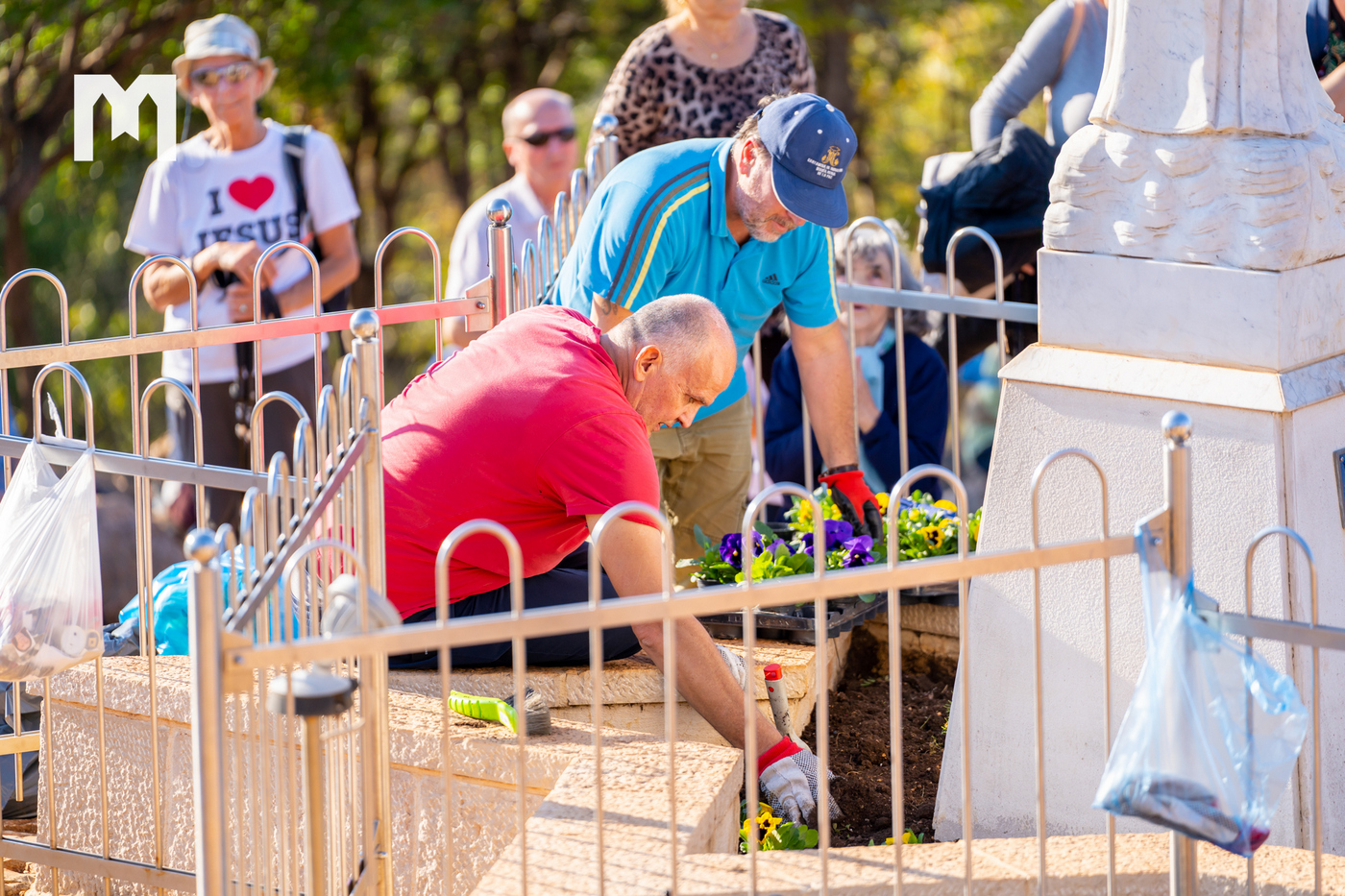 „Zadnji put kad smo sjedili gledali smo Gospin kip, a inače znamo kako odraditi posao oko cvijeća, no toga puta vidjeli smo područje oko kipa i sam kip kako su prljavi, što je i logično jer godinama sam kip kao kip nije čišćen. Tada smo došli na ideju da sa ovim akumulatorskim vodenim peračem, a koji se jako dobrim pokazao, očistimo Gospin kip, te kamen oko Gospina kipa. Kada smo vidjeli da je poslije toga kip bio prelijep i čist, sebi smo dali zadatak da to činimo i češće s vremena na vrijeme, kako bi Gospin kip izgledao onako kako bi i trebao izgledati. Bogu hvala, nama trojici, Borisu, Ini i meni je milost da možemo otići gore, zadržati se 3-4 sata, posaditi cvijeće, izmoliti koju krunicu, a osjećati se pored Gospe je milosno. Malo ću se našaliti i reći kako ovo cvijeće koje gore sadimo ima sreću u odnosu na ostale sadnice da ga je zapalo da bude baš kod Gospe”, kazao je Zvonimir, te još jednom naglasio da je Udruga uvijek spremna pomoći za što god treba vezano za održavanje Brda ukazanja i čišćenja Gospina kipa, a nadaju se da će se jednom naći i trajno rješenje oko vode i zalijevanja cvijeća oko Gospina kipa jer se to do sada uvijek radilo ručno.