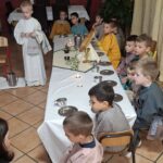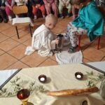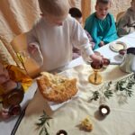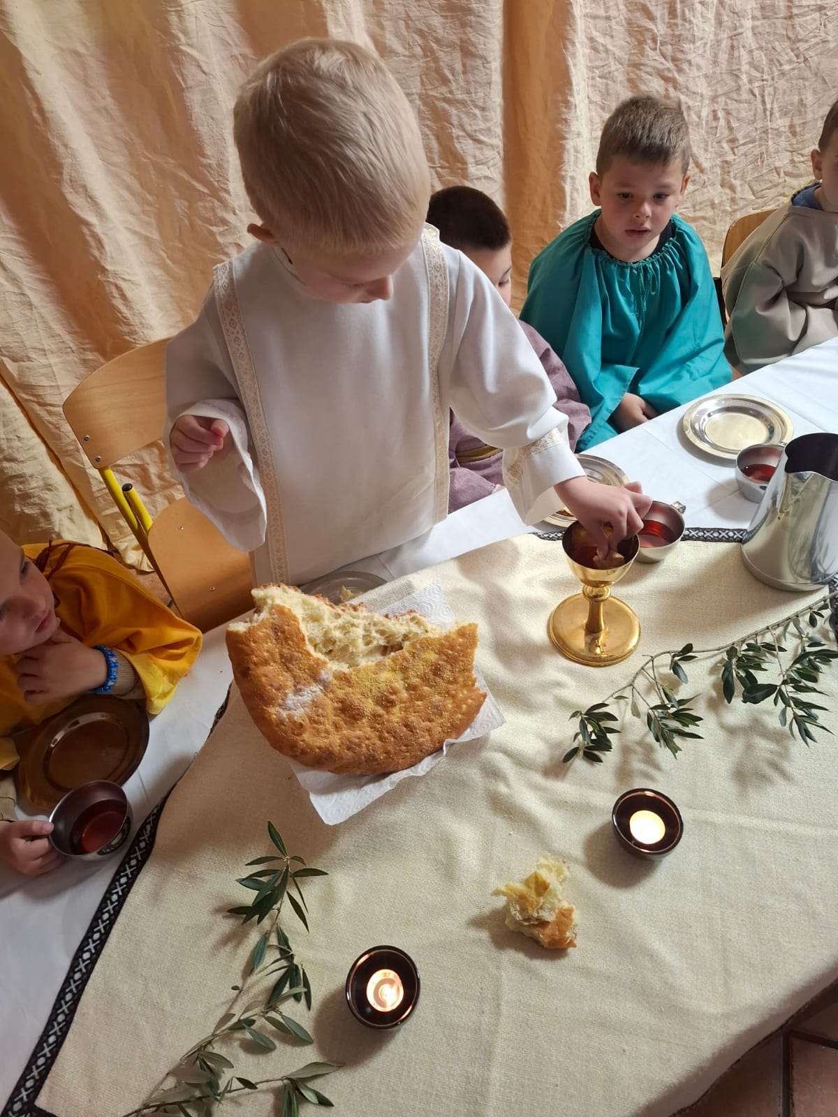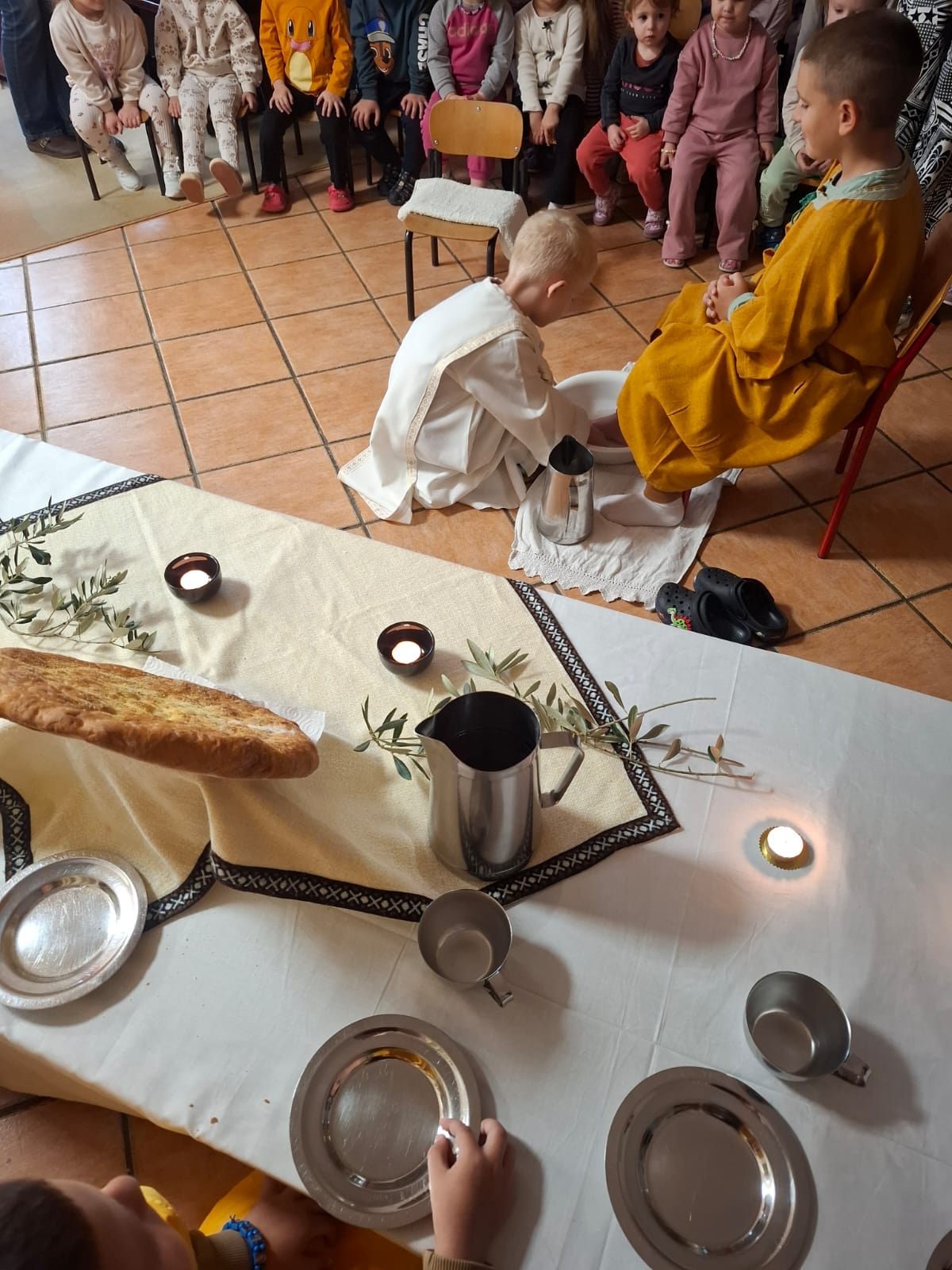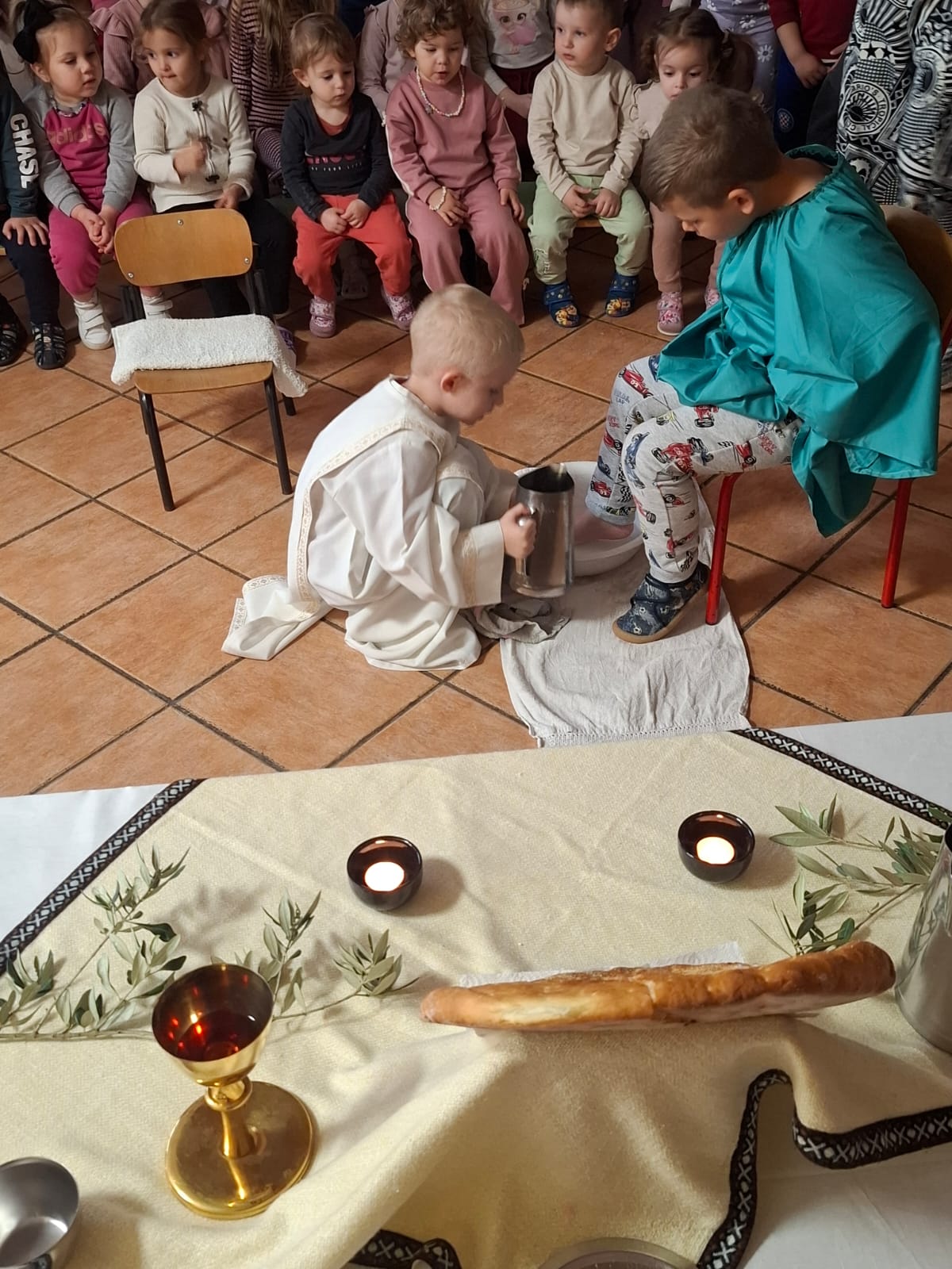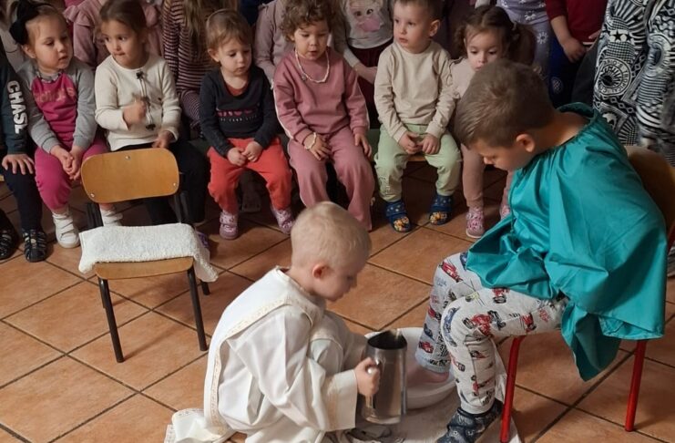 Djeca iz skupine ‘Kapljica’ s tetom Brankom Ostojić u sklopu ovih priprema za Uskrs na Veliki četvrtak uprizorili su Posljednju večeru. Obučeni u kostime apostola zajedno su blagovali, a zatim im je mali ”Učitelj” oprao noge.