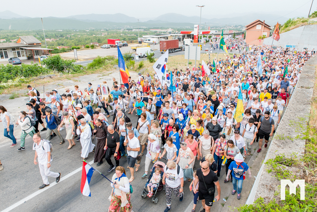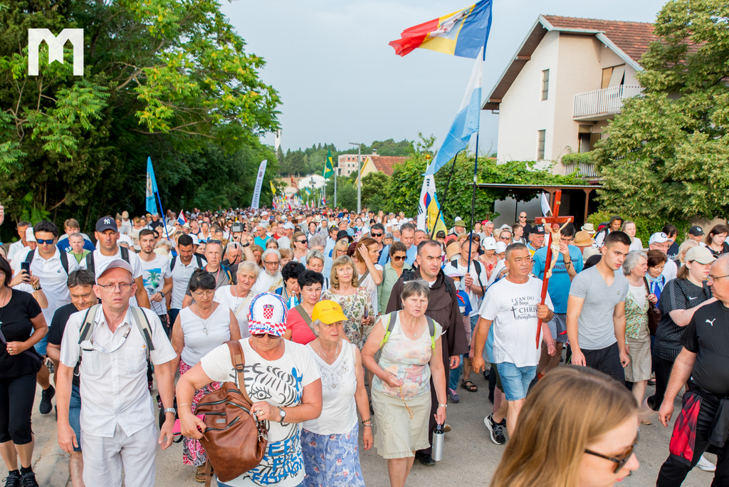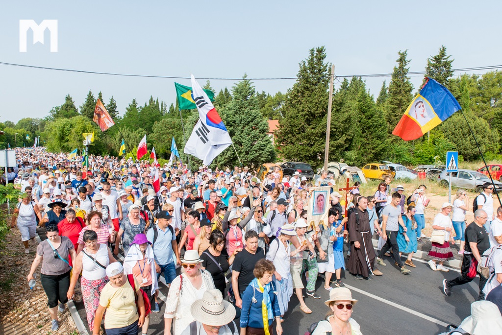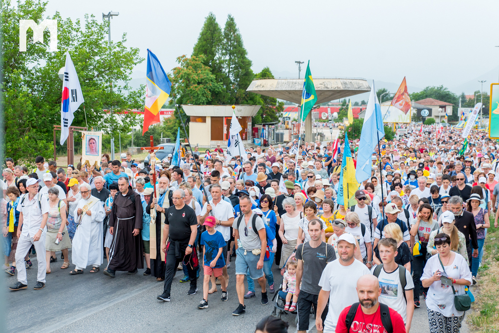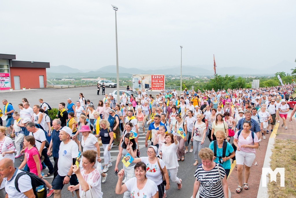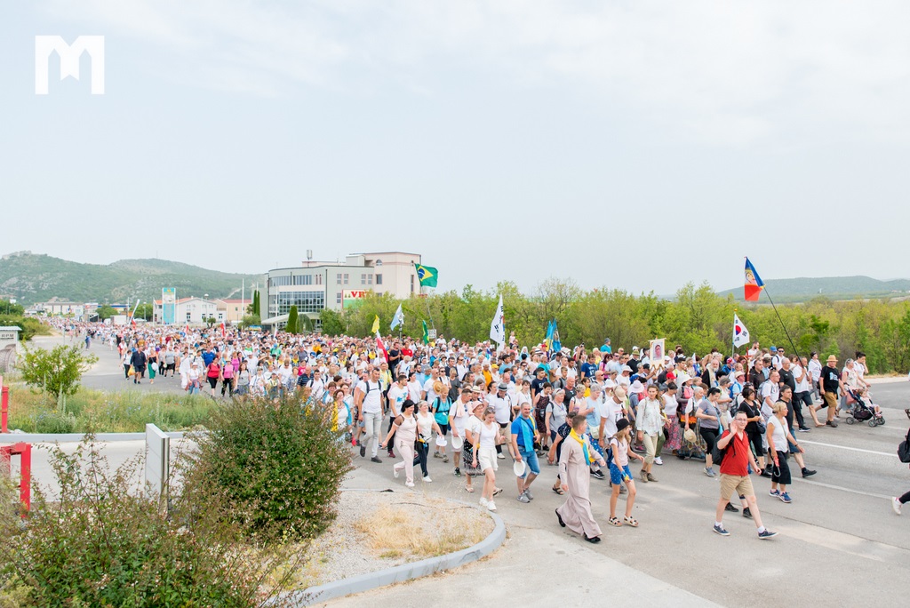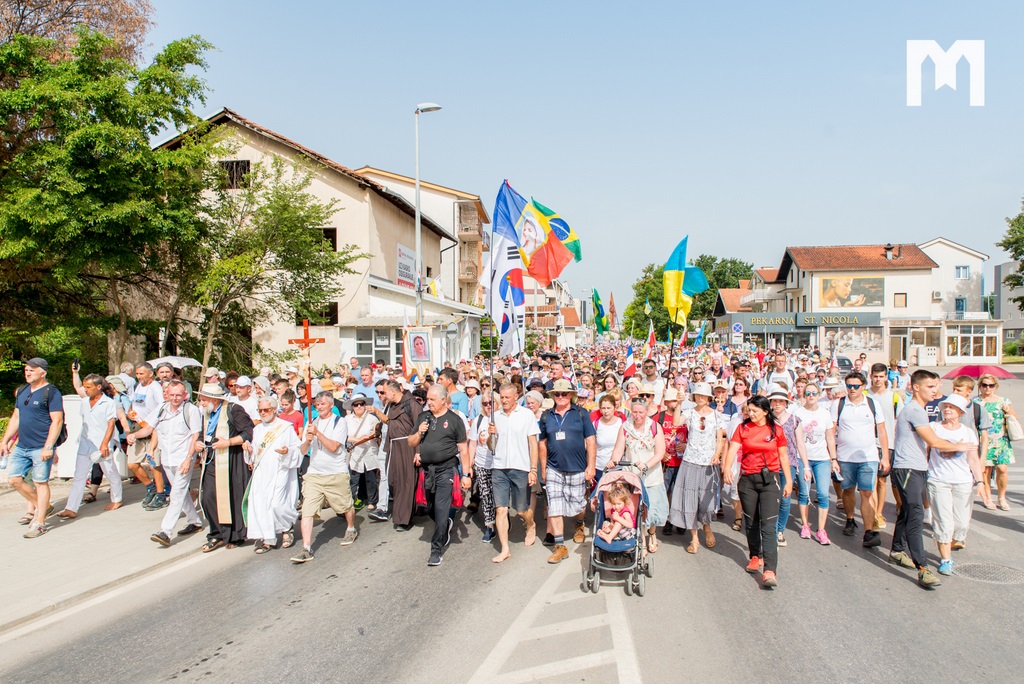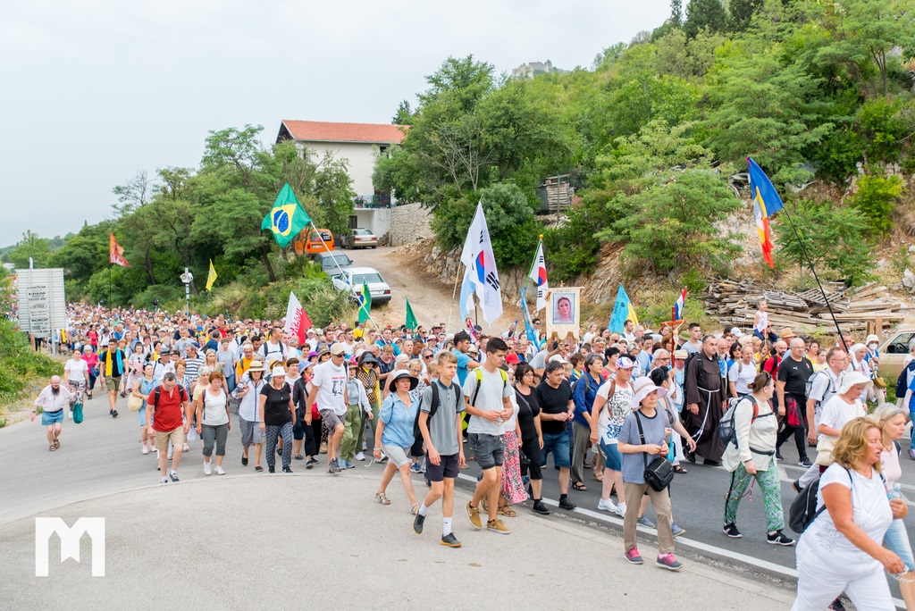 Tisuće hodočasnika iz cijeloga svijeta kao i župljani Međugorja i okolnih župa u impresivnoj koloni stigli su pred crkvu sv. Jakova u Međugorju u Hodnji mira koja je šest krenula ispred crkve sv. Ante na Humcu. Hodočasnike sa zastavama Brazila, Ukrajine, Hrvatske, Koreje, Francuske, Rumunjske, Austrije, Španjolske… na polasku je blagoslovio humački gvardijan fra Dario Dodig, kroz hodnju ih je vodio međugorski župnik fra Marinko Šakota, a pred crkvom sv. Jakova u Međugorju dočekao fra Zvonimir Pavičić, koji je na kraju Hodnje mira predvodio blagoslov s Presvetim oltarskim sakramentom.