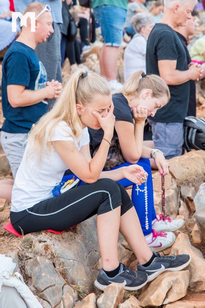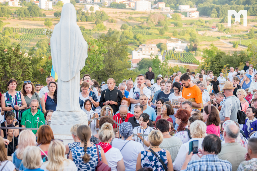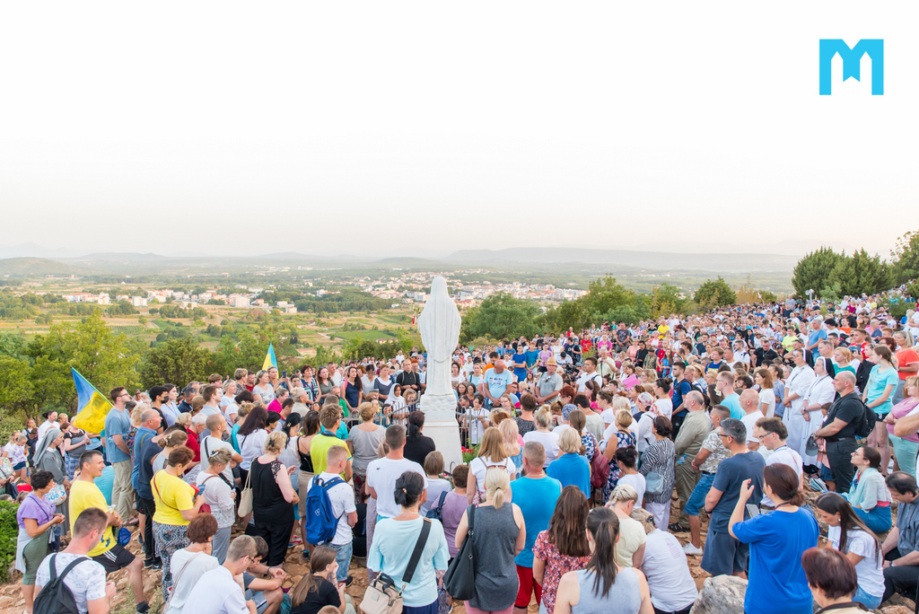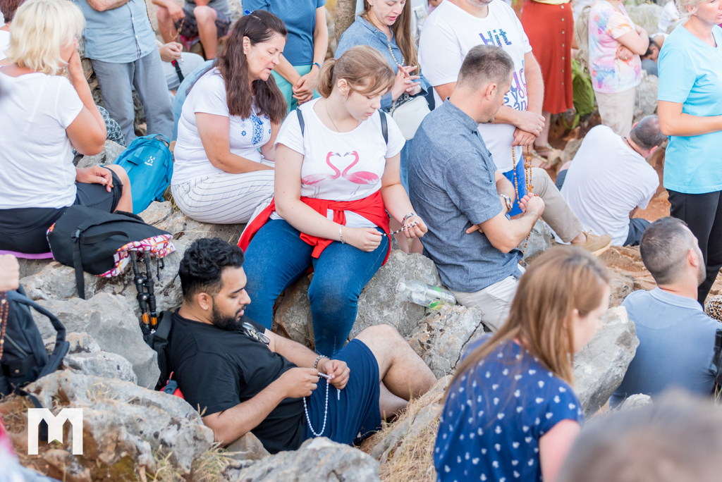 Očekujući uz pjesmu, zvuk zvona sa zvonika međugorske župne crkve sv. Jakova, točno u 6 sati ujutro, započeo je program 2. dana Međunarodnog molitvenog susreta mladih, koji se ove godine održava 32. put za redom, pod geslom “Koje dobro moram činiti”, iz Matejeva Evanđelja. Na Brdu ukazanja, zajedno s mladima iz 54 zemlje, krunicu su predmolili međugorski župnik fra Marinko Šakota i vidjelac Ivan Dragićević. Fra Marinko je na početku od srca pozdravio sve prisutne te nastavio: “Molimo sada krunicu, u zajedništvu s našom nebeskom Majkom Marijom, Kraljicom Mira, zajedno s Isusom. 40 godina Božje milosti, svega toga svjesni, molimo sada krunicu za mir, za Gospine nakane, da se mir Božji širi u srcima ljudi, u obiteljima i po svijetu!”