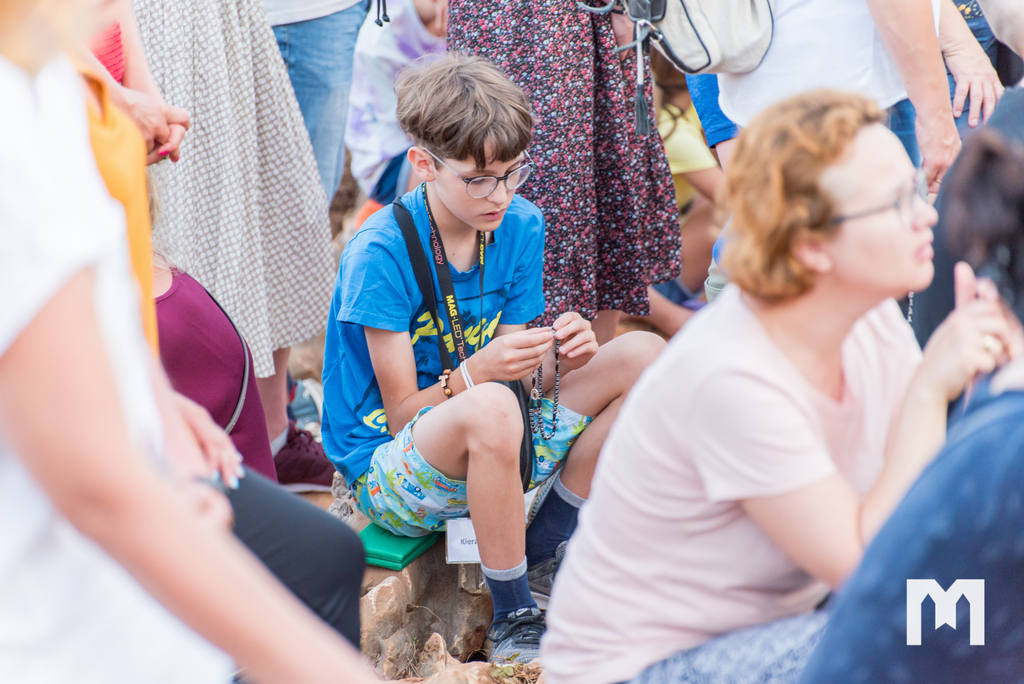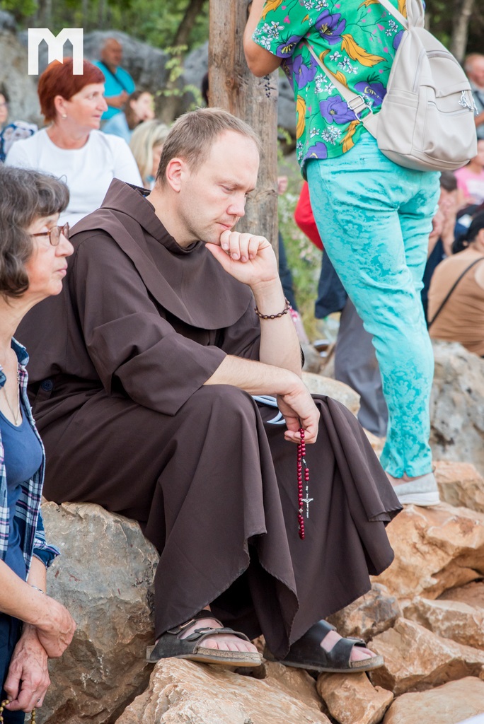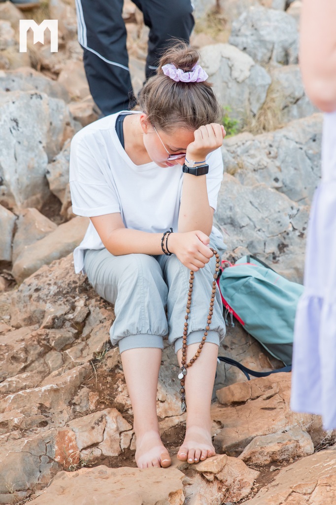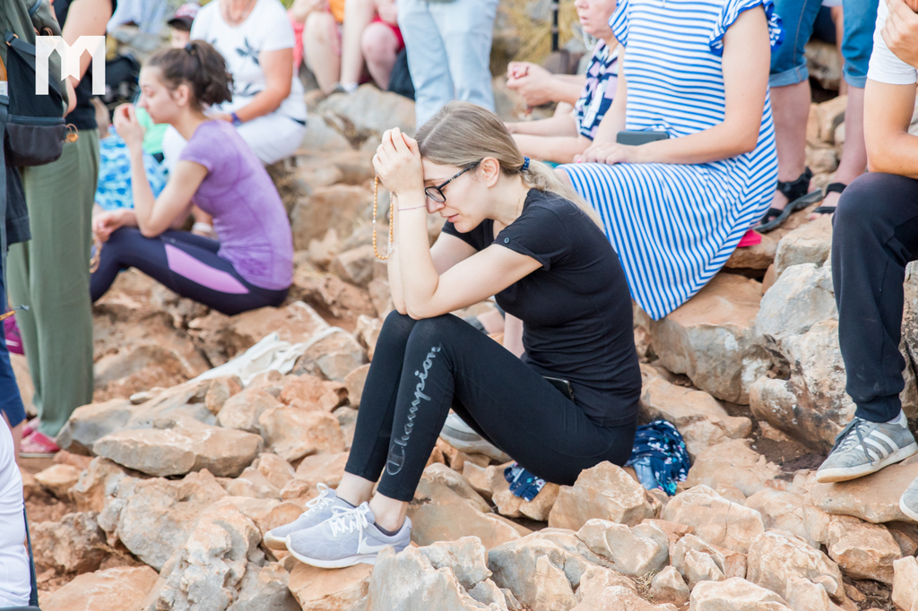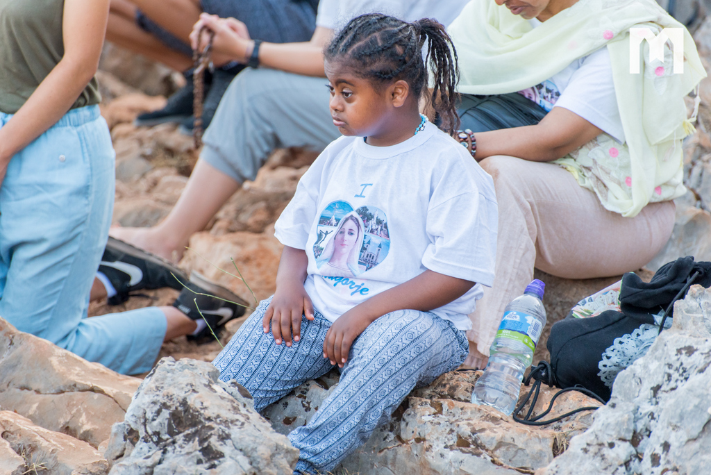 Očekujući uz pjesmu, zvuk zvona sa zvonika međugorske župne crkve sv. Jakova, točno u 6 sati ujutro, započeo je program 2. dana Međunarodnog molitvenog susreta mladih, koji se ove godine održava 32. put za redom, pod geslom “Koje dobro moram činiti”, iz Matejeva Evanđelja. Na Brdu ukazanja, zajedno s mladima iz 54 zemlje, krunicu su predmolili međugorski župnik fra Marinko Šakota i vidjelac Ivan Dragićević. Fra Marinko je na početku od srca pozdravio sve prisutne te nastavio: “Molimo sada krunicu, u zajedništvu s našom nebeskom Majkom Marijom, Kraljicom Mira, zajedno s Isusom. 40 godina Božje milosti, svega toga svjesni, molimo sada krunicu za mir, za Gospine nakane, da se mir Božji širi u srcima ljudi, u obiteljima i po svijetu!”