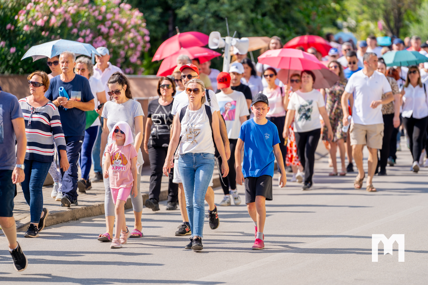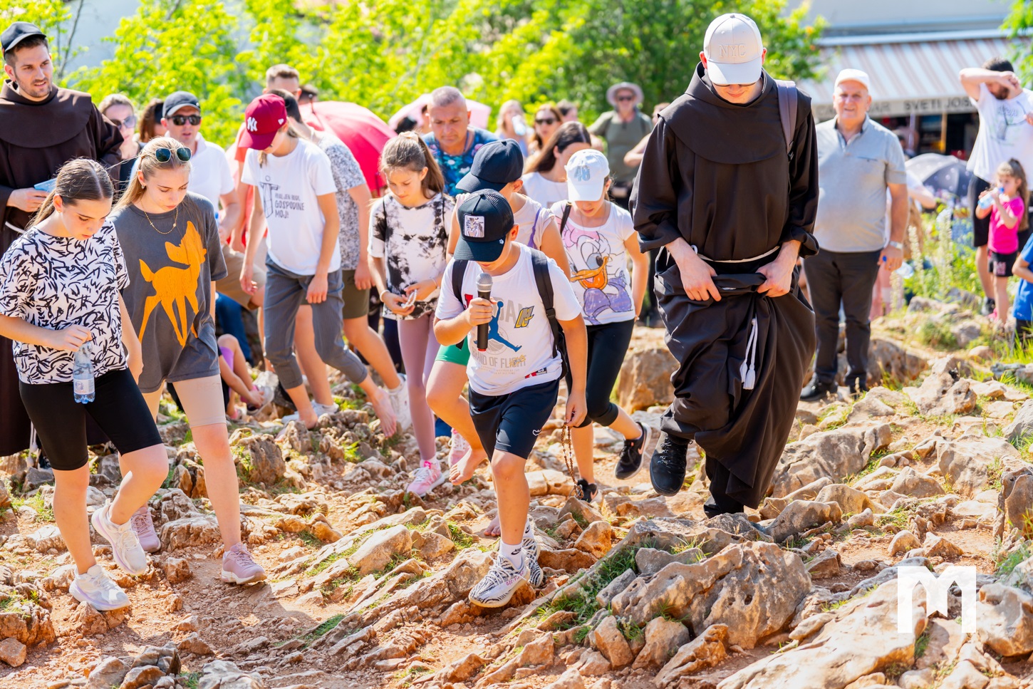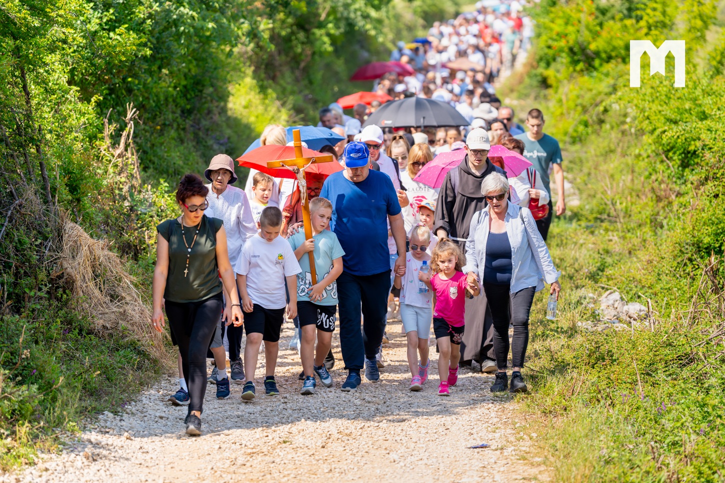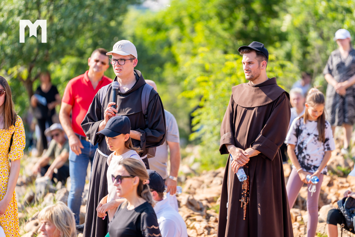 Dok ih je jako hercegovačko sunce nemilice pržilo, mladi, stari, očevi, majke i djeca su hodočašće započeli molitvom krunice Božjega milosrđa, a nastavili Gospinom krunicom uz razmatranje žalosnih i slavnih otajstava, te otajstava svjetla. Svake godine tijekom hodočašća nekoliko obitelji u župi Međugorje radosna srca ispred svojih domova ponudi okrjepu, a u znak zahvale fra Miro Šego je u ime svih hodočasnika njima podijelio prigodne darove. Nezaobilazna postaja vjernika na polovini hodočašća uvijek je obitelj Ostojić koja već treću godinu svaki put ispred svoga doma ponudi hodočasnicima veliku okrjepu s kolačima, vodom i sokovima, stoga su župljani na čelu sa župnikom fra Mirom Šegom odlučili zahvaliti im se. Kada su došli do njihova doma, kratko su se zaustavili, uzeli ponuđenu hranu i piće, a zatim je fra Miro darovao obitelji Ostojić umjetničku sliku na kojoj je naslikana Kraljica Mira, te im uputio prigodne riječi zahvale. Također, još nekoliko obitelji koje su nudile okrjepu su dobile na dar Novi Zavjet ili knjige o Međugorju. Hodočasnici su do Brda ukazanja stigli oko 16:45h kada su penjući se molili radosna otajstva Gospine krunice, te popevši se do Gospina kipa još izmolili Vjerovanje, sedam Očenaša, Zdravo Kraljice i Marijin hvalospjev – Veliča, a neki od njih su s nama podijelili svoje dojmove.