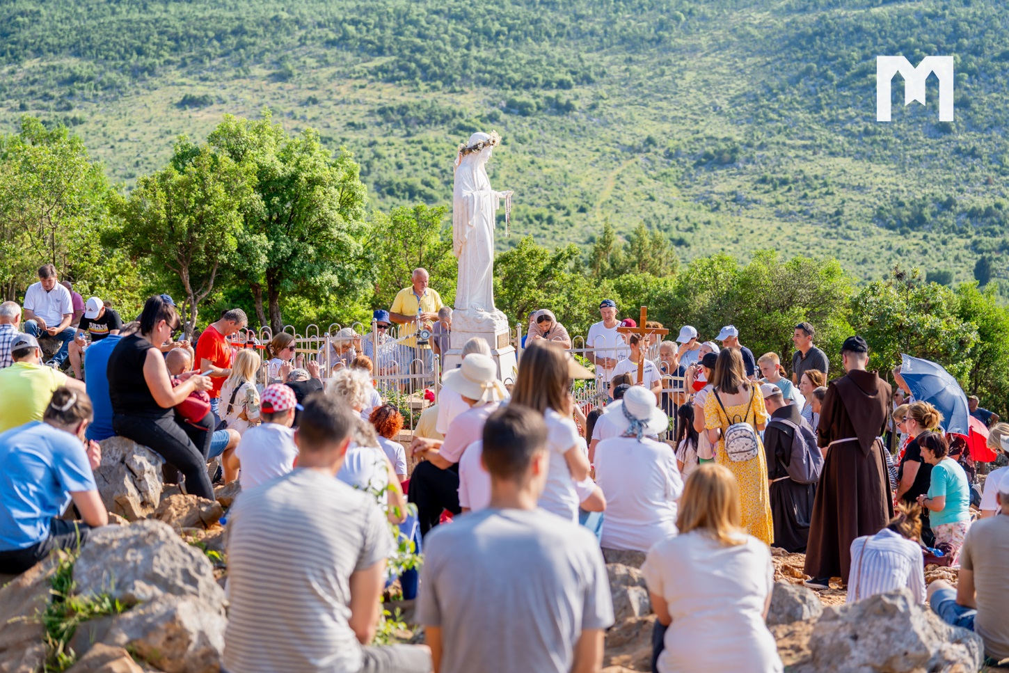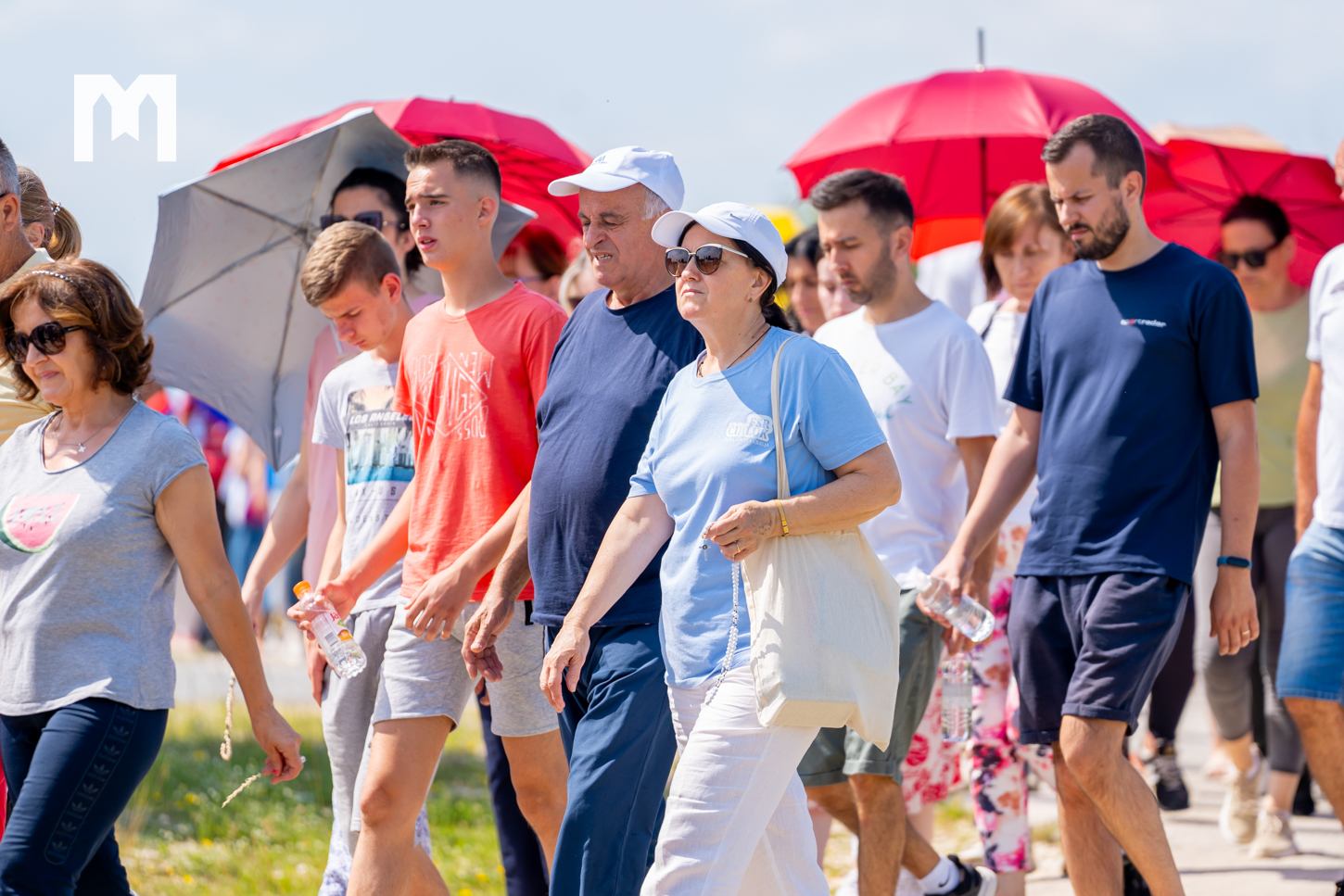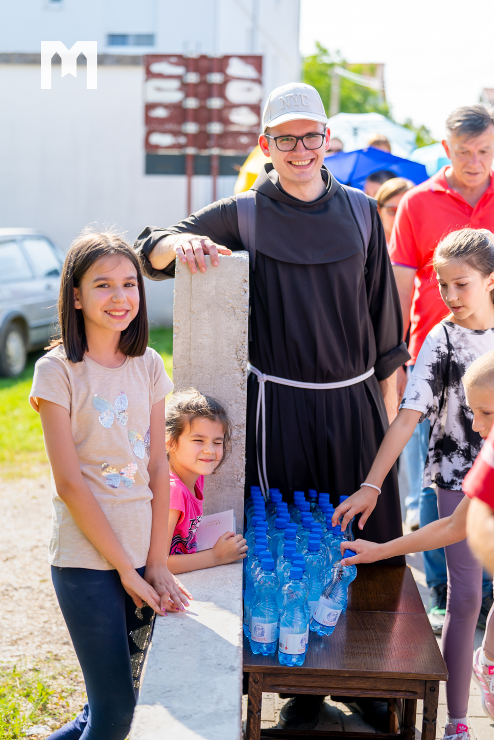 Dok ih je jako hercegovačko sunce nemilice pržilo, mladi, stari, očevi, majke i djeca su hodočašće započeli molitvom krunice Božjega milosrđa, a nastavili Gospinom krunicom uz razmatranje žalosnih i slavnih otajstava, te otajstava svjetla. Svake godine tijekom hodočašća nekoliko obitelji u župi Međugorje radosna srca ispred svojih domova ponudi okrjepu, a u znak zahvale fra Miro Šego je u ime svih hodočasnika njima podijelio prigodne darove. Nezaobilazna postaja vjernika na polovini hodočašća uvijek je obitelj Ostojić koja već treću godinu svaki put ispred svoga doma ponudi hodočasnicima veliku okrjepu s kolačima, vodom i sokovima, stoga su župljani na čelu sa župnikom fra Mirom Šegom odlučili zahvaliti im se. Kada su došli do njihova doma, kratko su se zaustavili, uzeli ponuđenu hranu i piće, a zatim je fra Miro darovao obitelji Ostojić umjetničku sliku na kojoj je naslikana Kraljica Mira, te im uputio prigodne riječi zahvale. Također, još nekoliko obitelji koje su nudile okrjepu su dobile na dar Novi Zavjet ili knjige o Međugorju. Hodočasnici su do Brda ukazanja stigli oko 16:45h kada su penjući se molili radosna otajstva Gospine krunice, te popevši se do Gospina kipa još izmolili Vjerovanje, sedam Očenaša, Zdravo Kraljice i Marijin hvalospjev – Veliča, a neki od njih su s nama podijelili svoje dojmove.