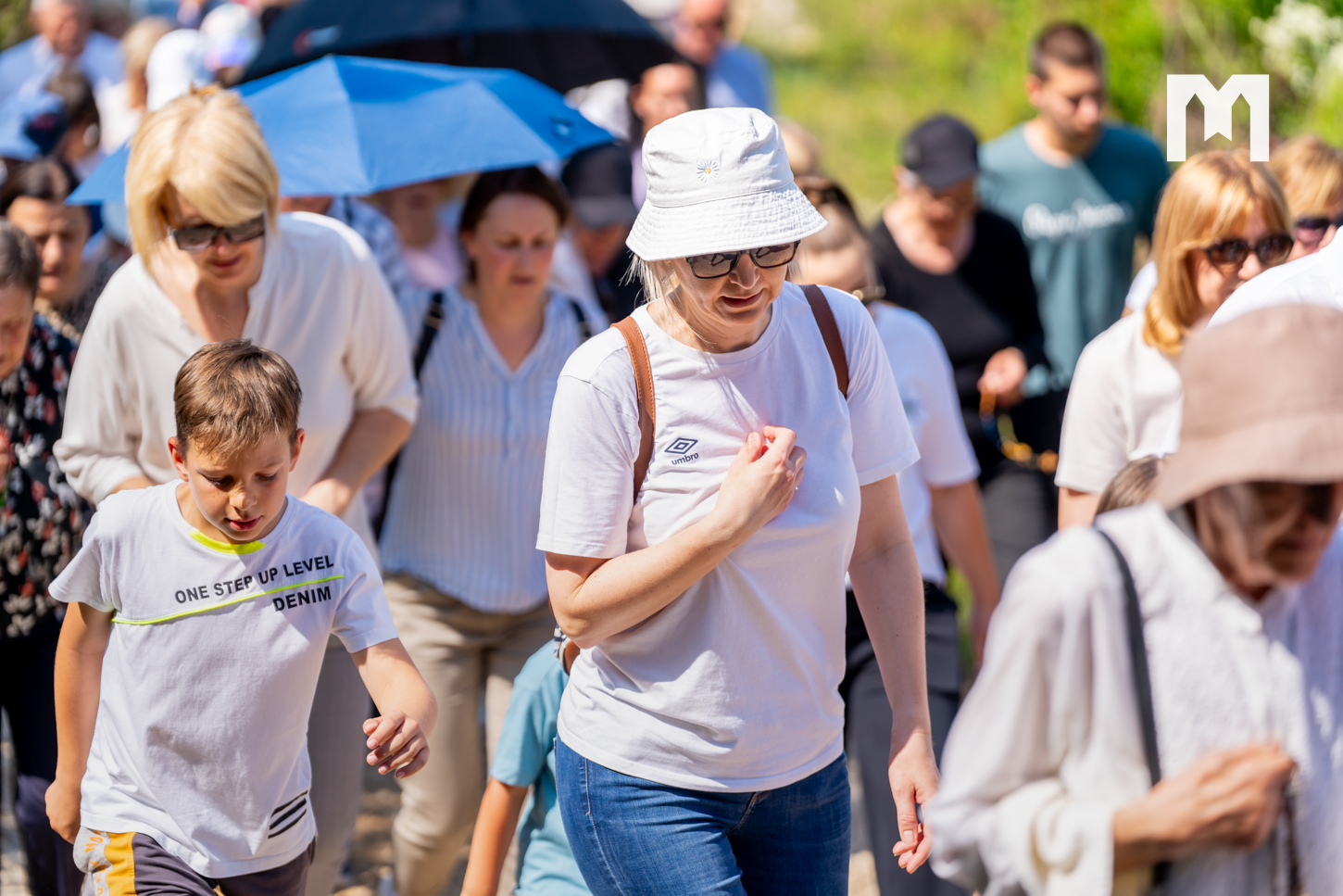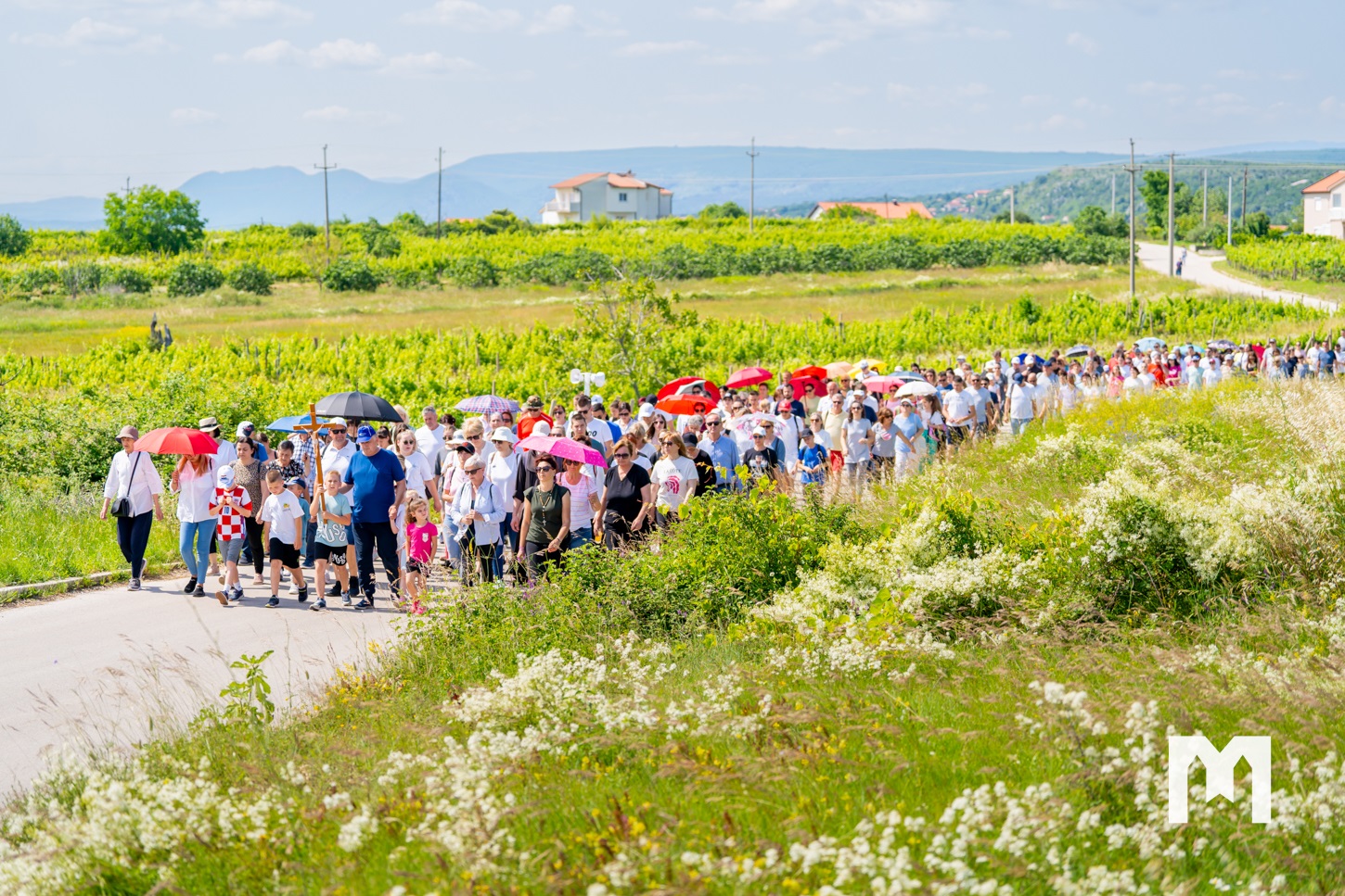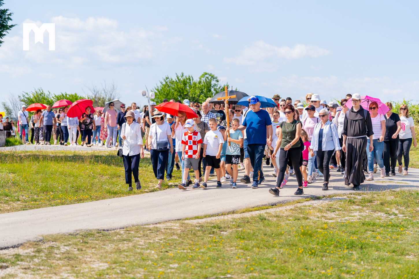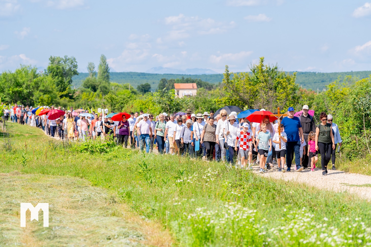 Dok ih je jako hercegovačko sunce nemilice pržilo, mladi, stari, očevi, majke i djeca su hodočašće započeli molitvom krunice Božjega milosrđa, a nastavili Gospinom krunicom uz razmatranje žalosnih i slavnih otajstava, te otajstava svjetla. Svake godine tijekom hodočašća nekoliko obitelji u župi Međugorje radosna srca ispred svojih domova ponudi okrjepu, a u znak zahvale fra Miro Šego je u ime svih hodočasnika njima podijelio prigodne darove. Nezaobilazna postaja vjernika na polovini hodočašća uvijek je obitelj Ostojić koja već treću godinu svaki put ispred svoga doma ponudi hodočasnicima veliku okrjepu s kolačima, vodom i sokovima, stoga su župljani na čelu sa župnikom fra Mirom Šegom odlučili zahvaliti im se. Kada su došli do njihova doma, kratko su se zaustavili, uzeli ponuđenu hranu i piće, a zatim je fra Miro darovao obitelji Ostojić umjetničku sliku na kojoj je naslikana Kraljica Mira, te im uputio prigodne riječi zahvale. Također, još nekoliko obitelji koje su nudile okrjepu su dobile na dar Novi Zavjet ili knjige o Međugorju. Hodočasnici su do Brda ukazanja stigli oko 16:45h kada su penjući se molili radosna otajstva Gospine krunice, te popevši se do Gospina kipa još izmolili Vjerovanje, sedam Očenaša, Zdravo Kraljice i Marijin hvalospjev – Veliča, a neki od njih su s nama podijelili svoje dojmove.