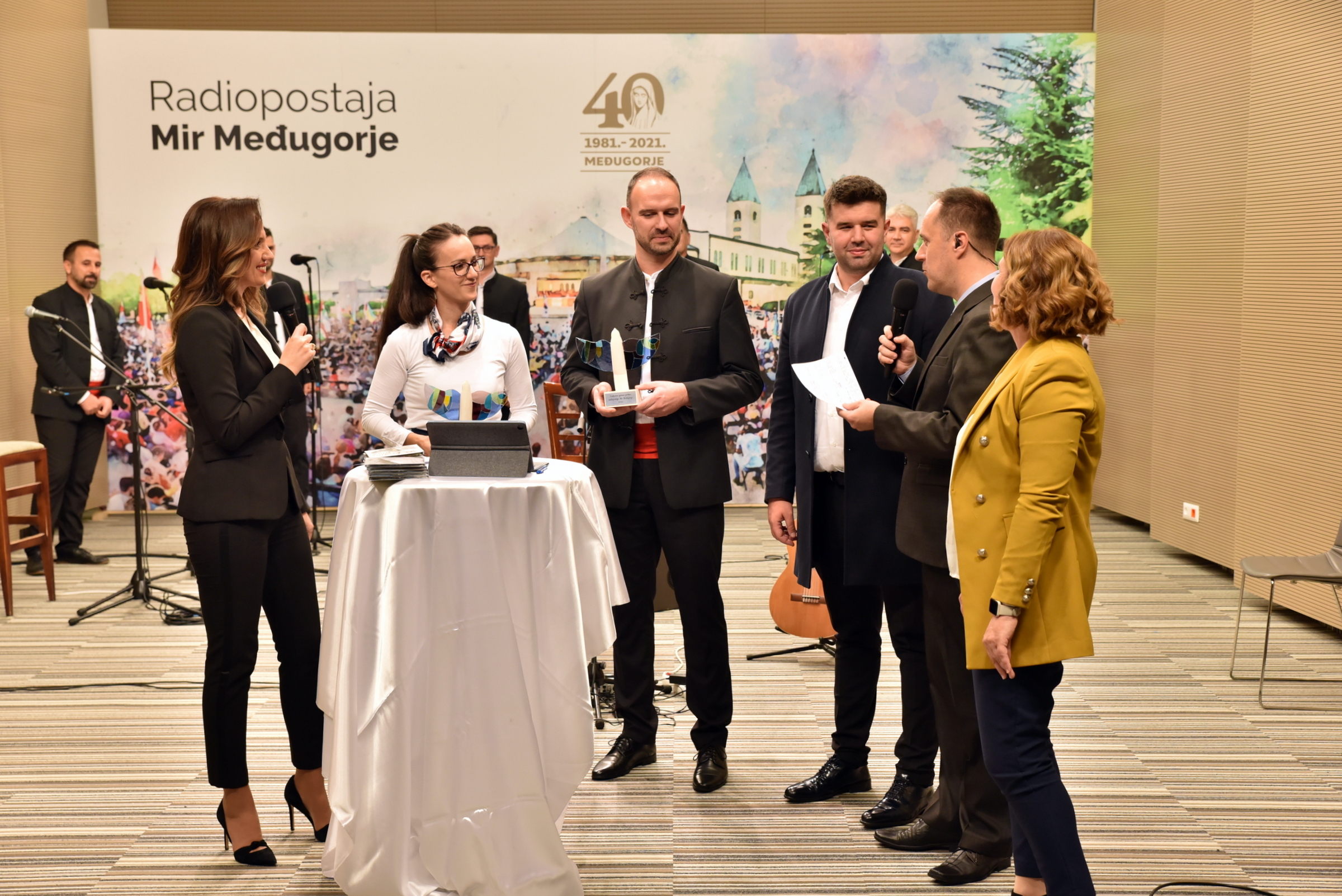 Nagrade, statue Golubica, rad akademskog kipara Josipa Ivušića Luciji Zovko i klapi Bratovština uručili su Katarina Beljo, glazbena urednica radiopostaje Mir Međugorje i Vedran Vidović, ravnatelj Informativnog centra Mir Međugorje.